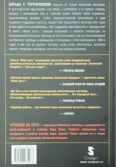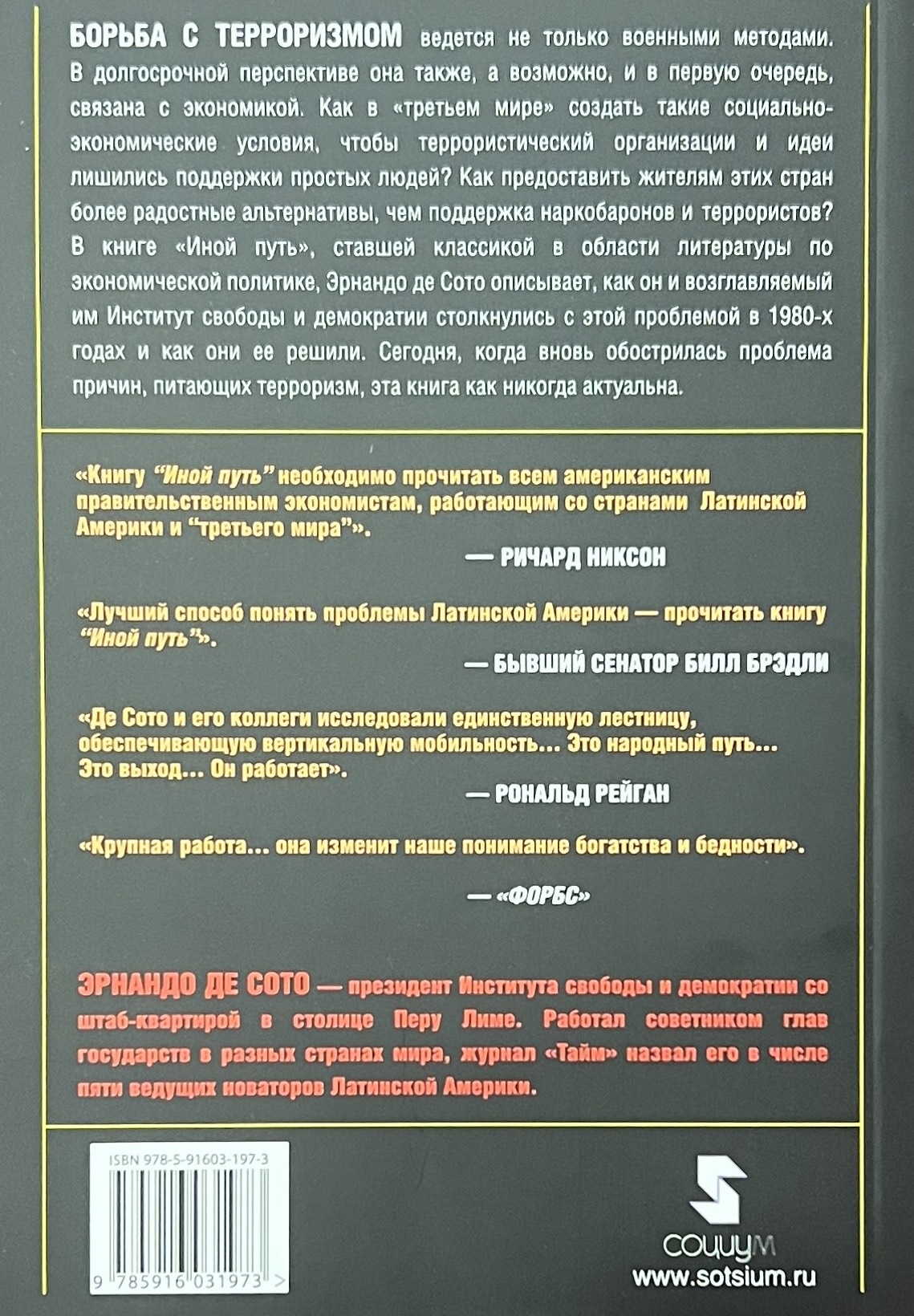 The book by the leading Peruvian economist E. de Soto, economic advisor to the President of Peru from 1989 to 1996, who initiated market reforms in a civil war-ridden, backward and impoverished country, was literally a bestseller in the 1980s, not only in Peru, but in the whole of Latin America. De Soto was able to prove with a huge empirical material that the causes of Peru's poverty and backwardness - the source of mutual hostility and lawlessness - were rooted in the imperfection of property laws, especially land ownership. Legalization of private property, de-bureaucratization of the economy and reduction of government intervention in economic activity is the only way to civil peace and prosperity - this conclusion is especially relevant for Russia. For the second edition, published in 2002, the author wrote a large preface, where he describes how economic reforms in Peru helped the country to cope with the terrorist movement "The Shining Path". It was in spite of the name of this terrorist organization that the book was called "Another Way". The author is known to Russian readers for his book "The Enigma of Capital: Why Capitalism Triumphs in the West and Fails in the Rest of the World".