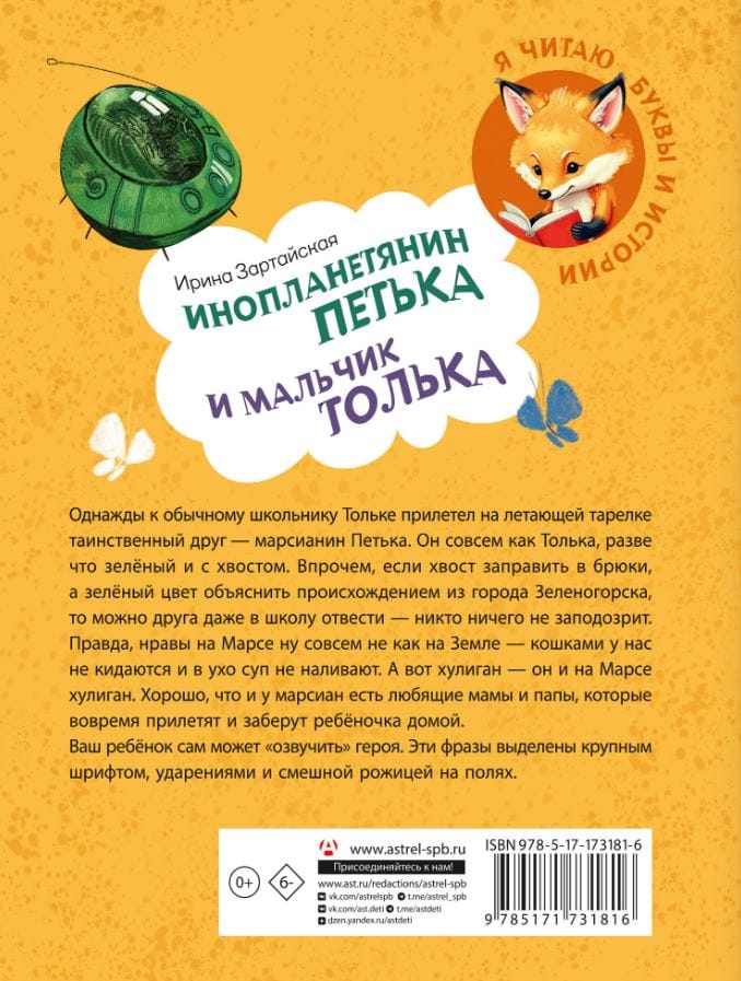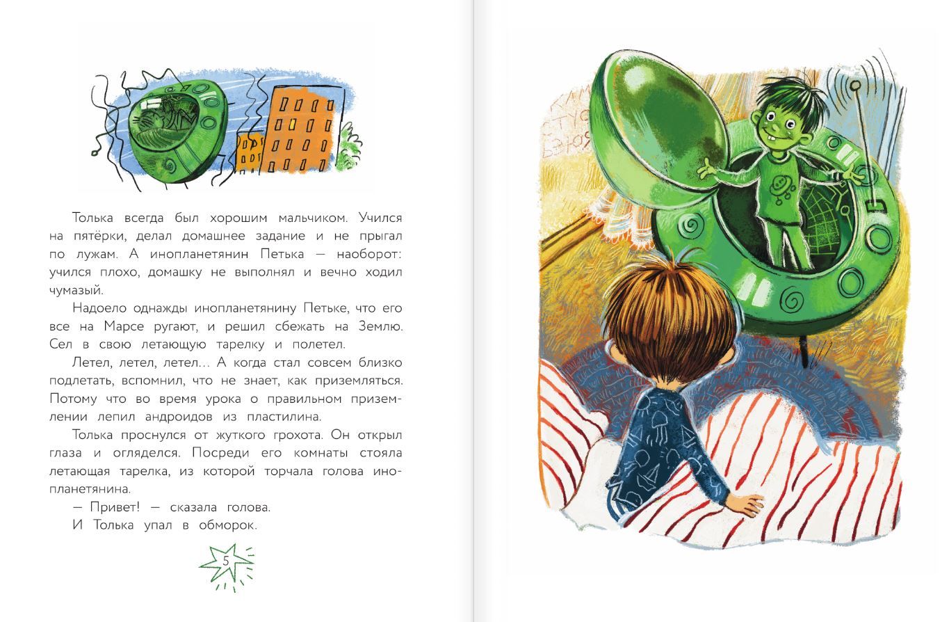 "Petka the Alien and Tolka the Boy" is a perfect fit for beginning readers. Anyone will be interested in "voicing" the hero of this book. It's convenient—the reading tests for children are specially highlighted in larger font and feature a funny face. The stress marks are also marked. And there are not many of them, so the number of lines won’t scare you at the start.