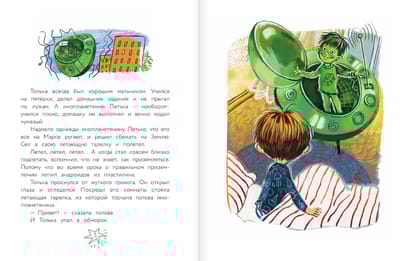 One day, a mysterious friend, Petka the Martian, arrives on a flying saucer to visit an ordinary schoolboy named Tolka. He's just like Tolka, except he's green and has a tail. However, if you tuck the tail into your pants and explain the green color by saying he's from Zelenogorsk, you could even take your friend to school without anyone suspecting anything. True, customs on Mars are completely different from Earth's—we don't throw cats or pour soup in your ear. But a bully is still a bully on Mars. It's good that Martians also have loving moms and dads who will arrive on time and take their child home.
