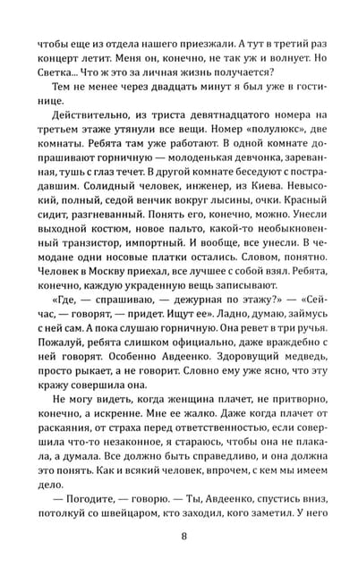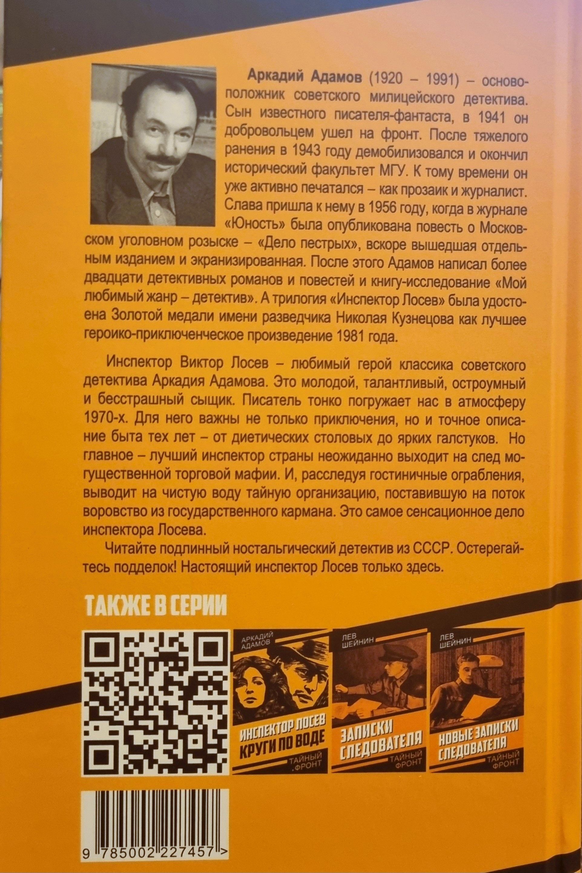 Inspector Viktor Losev is the favorite hero of the classic Soviet detective Arkady Adamov. He is a young, talented, witty and fearless detective. The writer subtly immerses us in the atmosphere of the 1970s. For him, not only adventures are important, but also an accurate description of the life of those years - from dietary canteens to bright ties. But the main thing is that the best inspector of the country unexpectedly comes on the trail of a powerful trading mafia. And, investigating hotel robberies, he brings to light a secret organization that has put theft from the state pocket on stream. This is the most sensational case of Inspector Losev. Read an authentic nostalgic detective story from the USSR. Beware of fakes! The real Inspector Losev is only here.