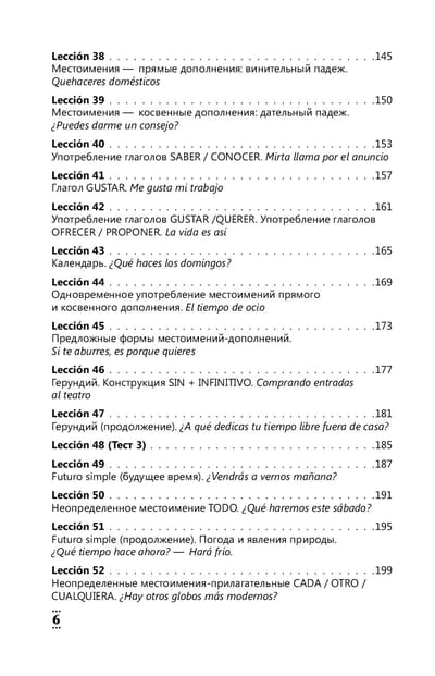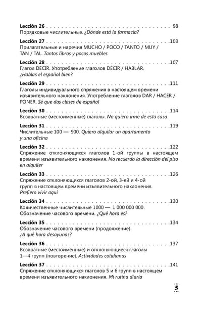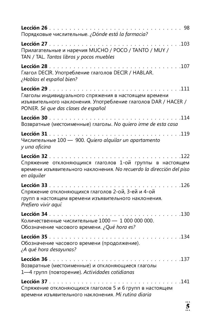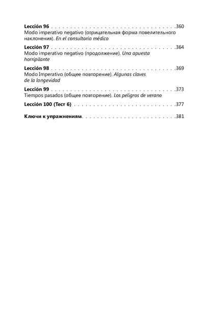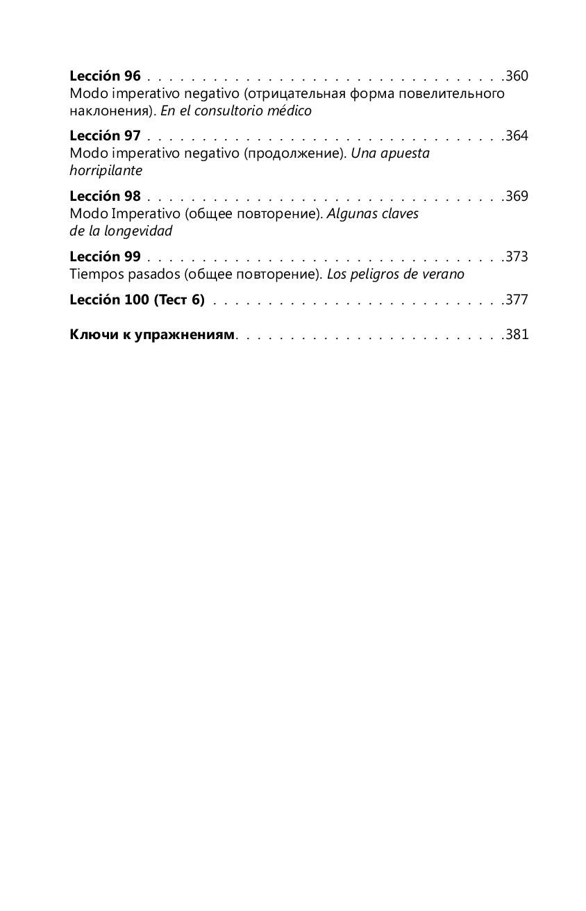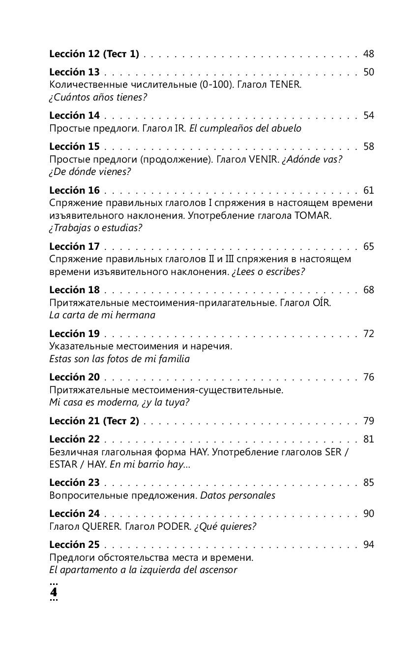 This textbook contains lexical and grammatical material for learning Spanish from level zero. The course is divided into 100 relatively small but intense lessons and is designed to be completed in 100 days, i.e. 1 lesson will take 1 day to master. A large number of exercises are offered for practicing language and speech skills, the keys to which are located at the end of the book. The manual will also teach you how to work with texts in Spanish.