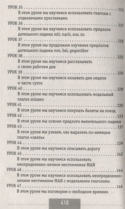 This textbook contains lexical and grammatical material for learning German from level zero. The course is divided into 100 relatively small but intense lessons and is designed to be completed in 100 days, i.e. it takes 1 day to master 1 lesson. A large number of exercises are offered for practicing language and speech skills, the keys to which are located at the end of the book. The manual will also teach you how to work with texts in German. The book is addressed to everyone who wants to master the German language without too much delay in the learning process and is ready for intensive self-study.