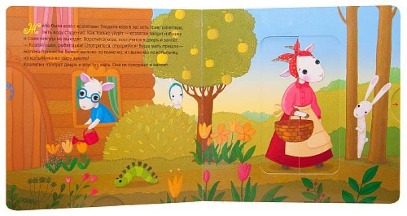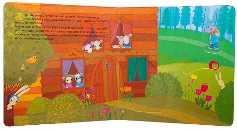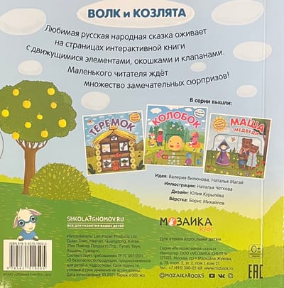The favorite Russian folk tale about the Wolf and the Goats comes to life on the pages of an interactive book with a wheel, moving elements, windows and valves.
