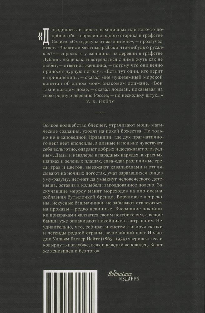 All magic fades, magical creatures lose their power, deities retire. But not in protected Ireland, where the spirit of the pragmatic age winds half-heartedly, and the marvelous still feel at ease, bestow gifts on the good and annoy the malicious. Ladies and gentlemen in ceremonial attire, in red hats and green cloaks, barely distinguishable among grasses and flowers, ride out in cavalcades and dance on night pogosts, teach the arrogant youths to be wise, and steal away a human cub, leaving an enchanted log in its cradle. Bored merrows beckon sailors to the bottom of the ocean, tempting them with a bottle of brandy. Grumpy leprechauns, skilled shoe-makers, don't forget to distract themselves with mischief - rarely innocent. Yesterday's dead are ghosted by their ruiners, and the faithful banshees are already mourning tomorrow's dead. No wonder that, collecting and systematizing the tales and legends of his native country, the greatest poet of Ireland William Butler Yeats (1865-1939) was convinced that "if you dig deeper, each and every one is a clairvoyant. The Celt is clairvoyant as it is".