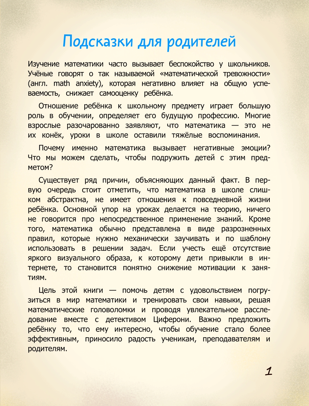 Why do we need mathematics? This question often arises among schoolchildren. A quest book with a detective plot, mathematical puzzles, comics and stickers will help children take a new look at school lessons. They will understand that the laws of mathematics surround a person. The search for clues will help children apply their knowledge in practice. They will practice performing arithmetic operations within 1000, repeat the multiplication table, fractions, easily solve problems on movement, on determining area, perimeter, remember geometric figures and more! As a result, the lessons will be understandable and interesting, and most importantly, "mathematical anxiety" will disappear forever.