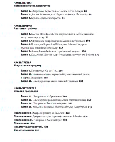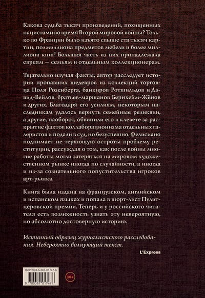 What is the fate of the many thousands of works of world art stolen by the Nazis during World War II? In France alone, more than 100,000 paintings, half a million pieces of furniture and more than a million books were seized! Most of them belonged to Jewish families and individual collectors. The author of the book quotes figures of 20-40 thousand - an impressive number of things that seem to have vanished into oblivion. Carefully studying all the facts and tracing the lost traces, Feliciano step by step investigates the stories of missing paintings from the collection of Parisian merchant Paul Rosenberg, bankers Rothschild and David Weil, brothers-marchand Bernheim-Jeune, collector Alphonse Kann and others. Thanks to his efforts, some heirs managed to recover family heirlooms, while others, on the contrary, accused him of defamation for revealing the collaborationism of certain gallerists and sued him, but without success. Feliciano raises the ever-present problem of restitution, discussing how, after the war, many works could be lost on the world art market, sometimes by accident and sometimes because of the deliberate connivance of art market players. The author pays special attention to the role of Switzerland in the looting of France, as many stolen works of art were discovered there after the war.
