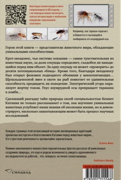 The heroes of this book are some of nature's most amazing creatures, possessing absolutely incredible abilities. Research biologist Kenneth Catania explains why the star-nosed mole has strange appendages around its nose, how the tentacle-bearing snake, resorting to cunning, makes fish swim right into its mouth, how the electric eel "remotely controls" other animals, how emerald wasps zombify cockroaches, reveals the secret of the "worm spell" that lures earthworms out of the soil... Filled with many amazing facts, this book is a fascinating journey into the world of Mother Nature's grandiose plans, in which there is still so much unsolved.