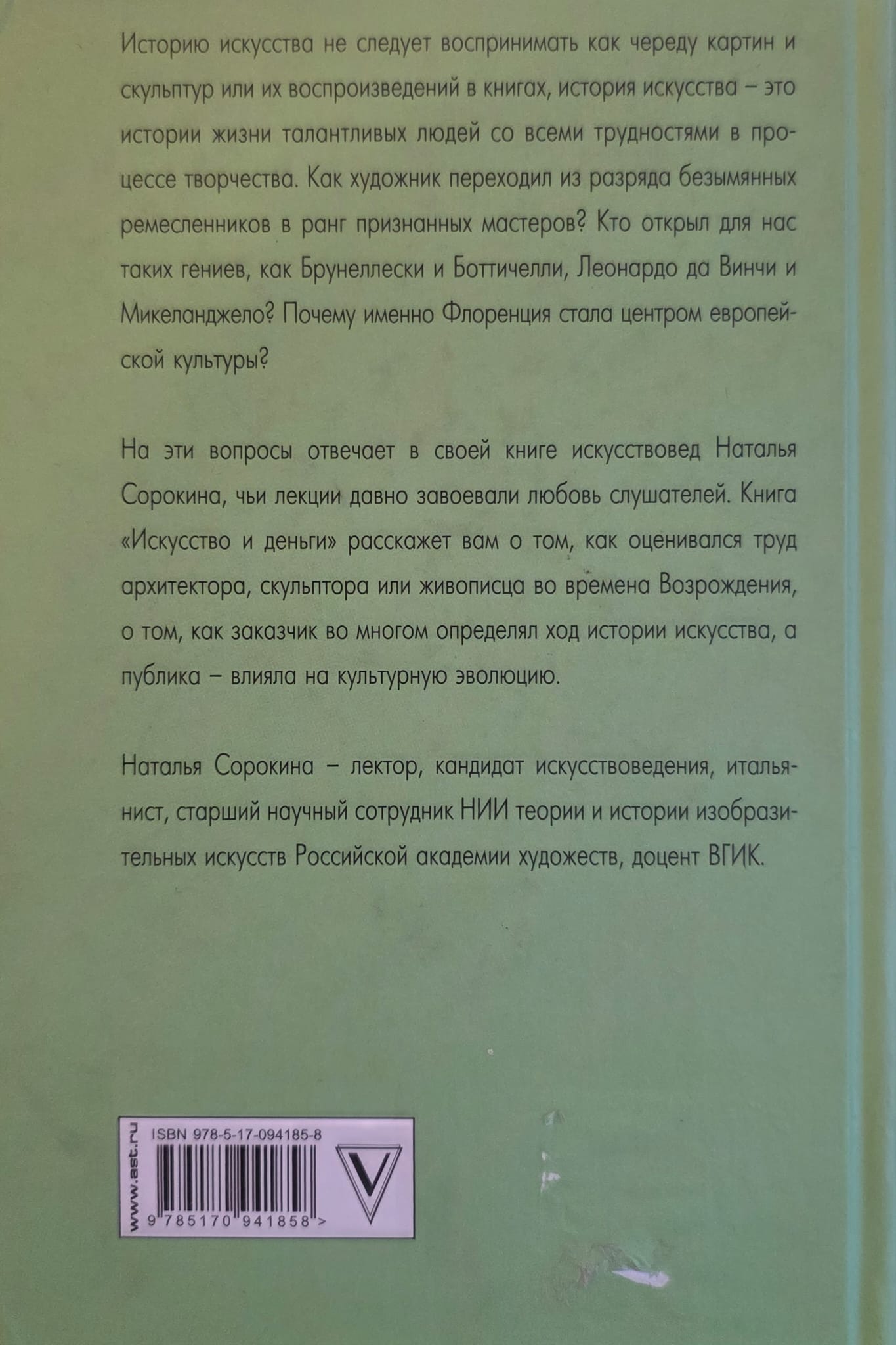The history of art should not be perceived as a series of paintings and sculptures or their reproductions in books, the history of art is the life stories of talented people with all the difficulties in the creative process. Not at all stages of human history were artists honored and singled out as a caste of special people, marked by God... How did an artist move from the ranks of anonymous artisans to the rank of recognized masters? Who discovered such geniuses as Brunelleschi and Botticelli, Leonardo da Vinci and Michelangelo for us? Why did Florence become the center of European culture? Art historian Natalia Sorokina, whose lectures have long won the love of listeners, answers these questions in her book. The book "Art and Money" will tell you how the work of an architect, sculptor or painter was assessed during the Renaissance, how the customer largely determined the course of art history, and the public influenced cultural evolution. Natalia Sorokina is a lecturer, PhD in art history, Italianist, senior research fellow at the Research Institute of Theory and History of Fine Arts of the Russian Academy of Arts, and associate professor at VGIK.