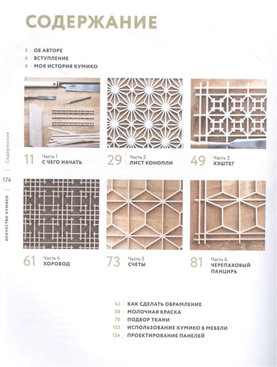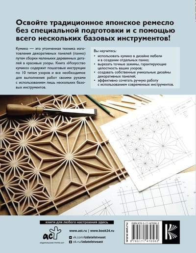 Kumiko is a sophisticated technique for making decorative panels (panels) by assembling small wooden pieces into beautiful patterns. This book contains step-by-step instructions for 10 types of patterns and everything you need to do the work yourself with just a few basic tools. You will learn how to use kumiko in furniture design and in the creation of individual panels, how to cut precise clips that guarantee the integrity of your patterns, how to create your own unique decorative panel designs, and how to effectively combine handwork with the use of modern tools.