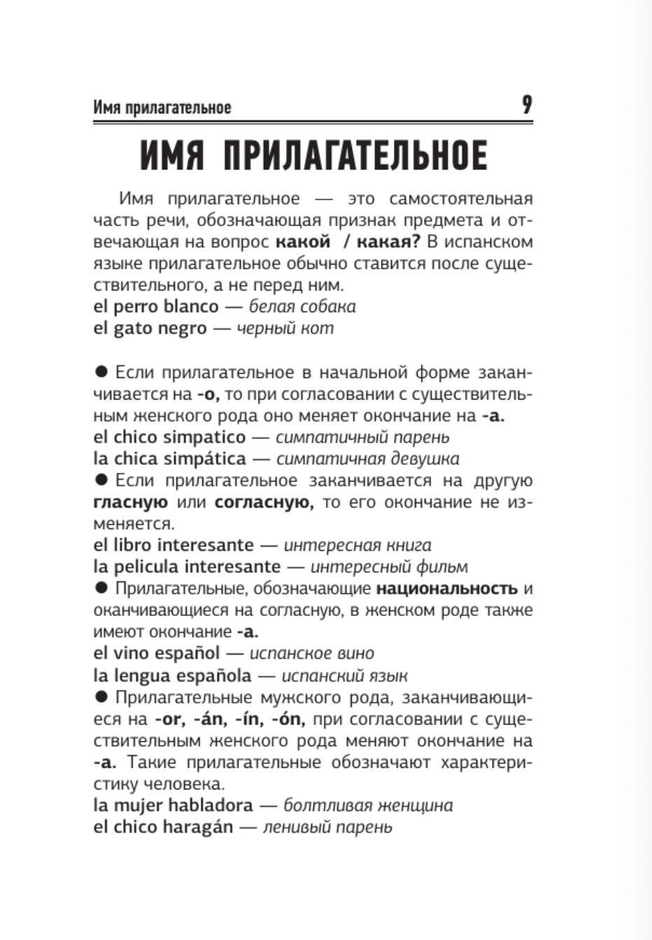 This manual presents all the main sections of grammar, the most important and complex aspects are considered. The material is presented in clear and visual diagrams, which contributes to quick and high-quality assimilation. The manual will become an indispensable assistant in learning Spanish, it is easy to learn and repeat.