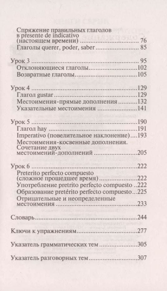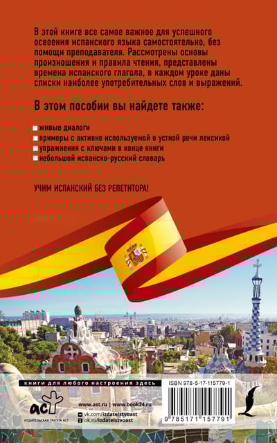 This self-teacher will help readers master the basics of Spanish on their own without the help of a teacher. In this book you will find the rules of reading and pronunciation, the most necessary grammar topics, as well as learn the basic Spanish tenses. The material in the manual is set out as clear and accessible as possible, well memorized thanks to a large number of examples with commonly used vocabulary. Each lesson is accompanied by a glossary with vocabulary that will be used in the lesson.
