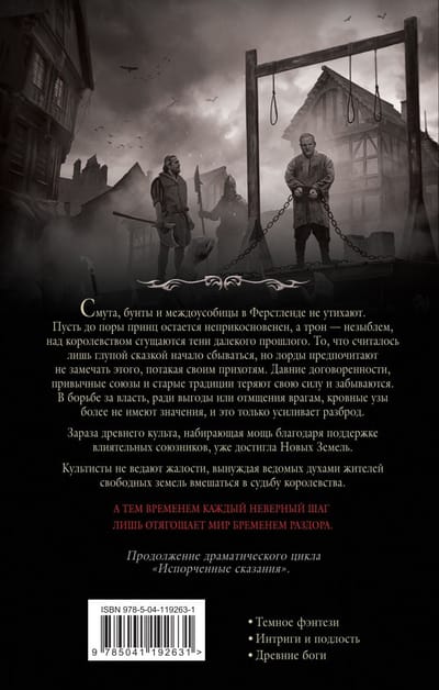 Excellent development of characters shows the complex relationships of the heroes, explains their actions and reveals the consequences. Turmoil, rebellion and civil strife in Firstland do not subside. Although the prince remains inviolable for the time being, and the throne is unshakable, the shadows of the distant past are gathering over the kingdom. What was considered just a stupid fairy tale has begun to come true, but the lords prefer not to notice this, indulging their whims. Long-standing agreements, familiar alliances and old traditions are losing their power and are forgotten. In the struggle for power, for the sake of profit or revenge on enemies, blood ties no longer matter, and this only increases discord. The infection of an ancient cult, gaining strength thanks to the support of influential allies, has already reached the New Lands. The cultists know no mercy, forcing the inhabitants of the free lands, led by spirits, to intervene in the fate of the kingdom. Meanwhile, every false step only burdens the world with the burden of discord. Continuation of the dramatic cycle "Spoiled Tales", the second volume.