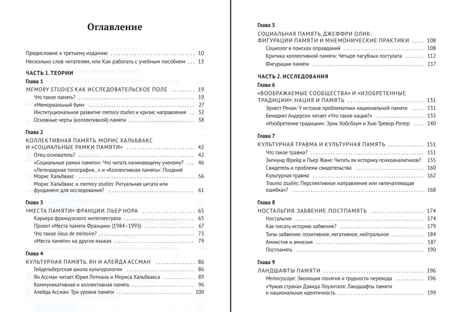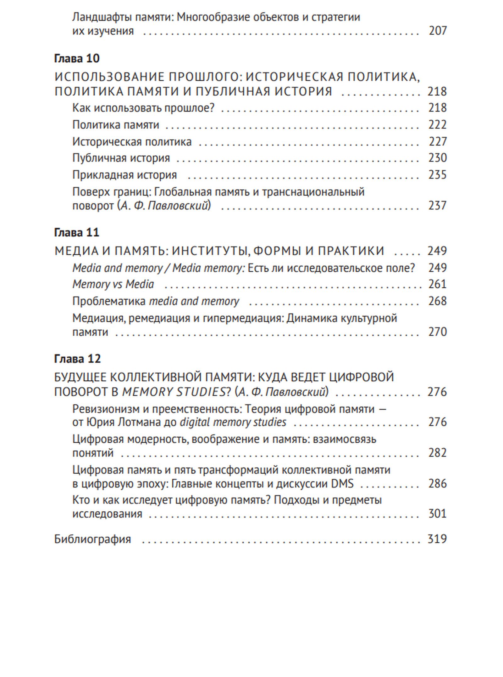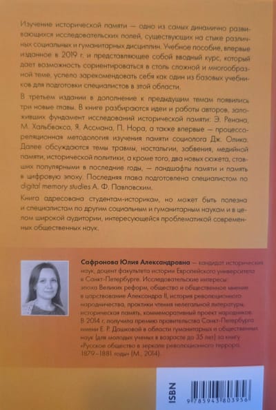 The third edition, in addition to the previous chapters, includes three new chapters. The first part explores the ideas and works of authors who laid the foundations for historical memory studies: E. Renan, M. Halbwachs, J. Assmann, and P. Nohr, as well as, for the first time, sociologist J. Olik's process-relational methodology for studying memory. The second part discusses themes of trauma, nostalgia, oblivion, media memory, historical politics, and two new topics that have become popular in recent years: memory landscapes and memory in the digital age. The final chapter was prepared by digital memory studies specialist A. F. Pavlovsky. Each chapter is followed by assignments and a bibliography.