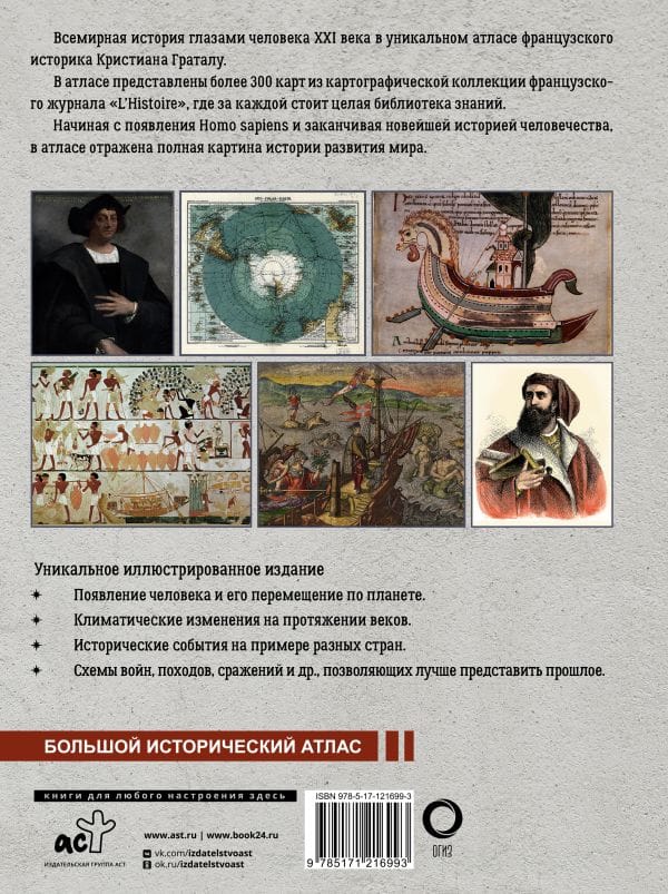 World history through the eyes of a 21st century man in a unique atlas by French historian Christian Gratalu. The atlas features more than 300 maps from the cartographic collection of the French magazine "L'Histoire", where behind each map is a whole library of knowledge. From the emergence of Homo sapiens to the recent history of mankind, the atlas presents a complete picture of the history of the world's development.
