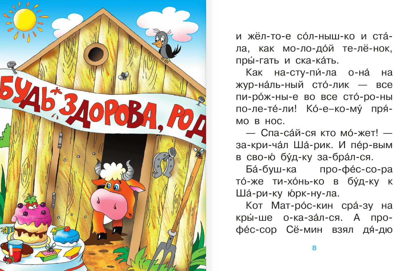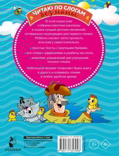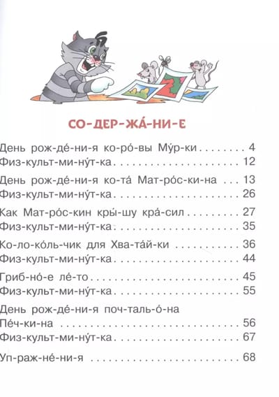 The book includes fairy tale stories by E. Uspensky about the adventures of Uncle Fyodor, Martoskin and Sharik in the legendary village of Prostokvashino. They are sure to please the baby and will contribute to the consolidation of the skill of syllabic reading. The book is supplemented with exercises to improve reading technique. Fizkultminutki with finger gymnastics will help to activate the brain and concentrate attention.