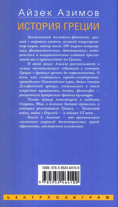 In this book, Asimov tells about the most impressive events in the history of Greece from ancient times to the present day. About how city-states were created, the Olympic Games were held, the Delphic Oracle gave advice, musicians, poets, philosophers competed in their art - a beautiful ancient culture flourished. The author also tells about the fall of Sparta, Thebes, about the great battles of the past in which Greece participated - the Trojan War, the war with Persia - and the wars of the 20th century.