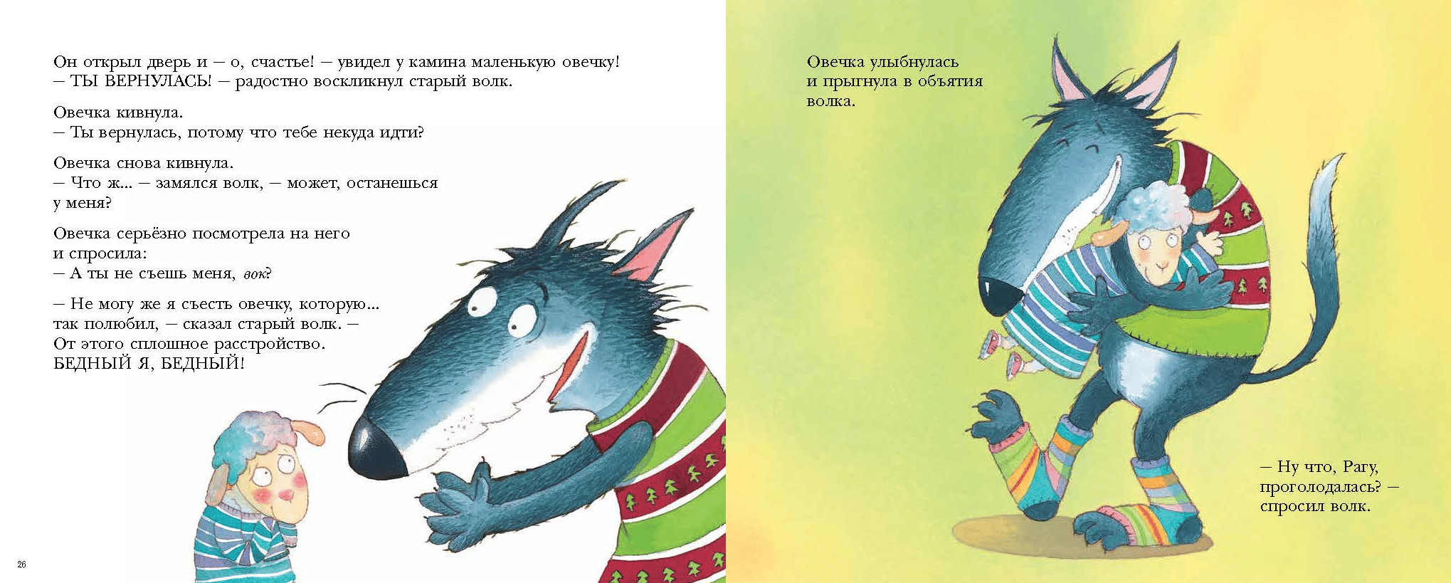 One day, a little sheep knocked on the door of a hungry wolf. The wolf couldn't believe his luck - he had been dreaming of eating a meat stew for so long, and now, at last, the "stew" had come to his paws! But the sheep was shivering so much that the wolf had to warm it up first (he hated frozen food). Then the sheep began to hiccup and the wolf calmed it down for a long time (he was afraid that hiccups are contagious and that eating a hiccuping sheep would make him sick). In short, one by one, the wolf did not notice how, while preparing the sheep for dinner, he became fond of it and could not just take it and eat it.