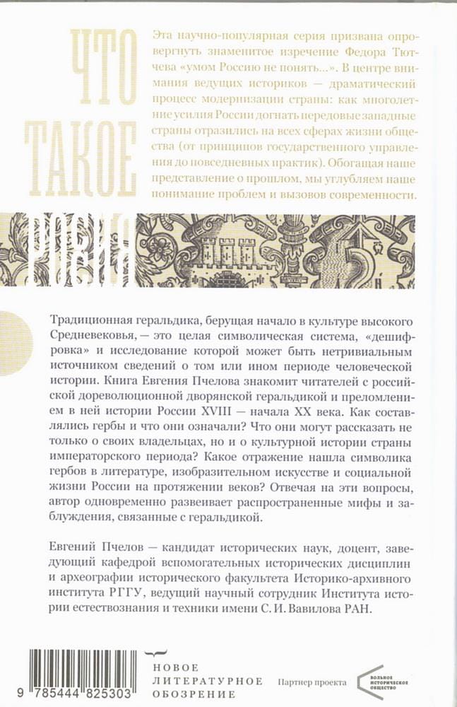 Traditional heraldry, originating in the culture of the High Middle Ages, is a whole symbolic system, the “deciphering” and study of which can be a non-trivial source of information about a particular period of human history. Evgeny Pchelov’s book introduces readers to the Russian pre-revolutionary noble heraldry and the refraction of the history of Russia of the XVIII – early XX centuries. How were the coats of arms formed and what did they mean? What can they tell not only about their owners, but also about the cultural history of the country of the imperial period? What is the symbolism of coats of arms reflected in literature, fine arts and social life of Russia for centuries? Answering these questions, the author simultaneously dispels common myths and misconceptions associated with heraldry. Evgeny Pchelov – Candidate of Historical Sciences, Associate Professor, Head of the Department of Auxiliary Historical Disciplines and Archaeography of the Historical Faculty of the Historical and Archival Institute of RSUH, Leading Researcher of the S. I. Vavilov Institute of Natural History and Technology of the Russian Academy of Sciences.