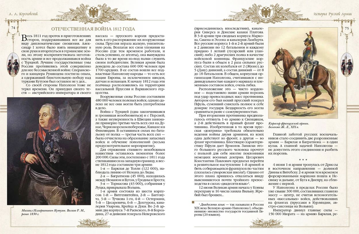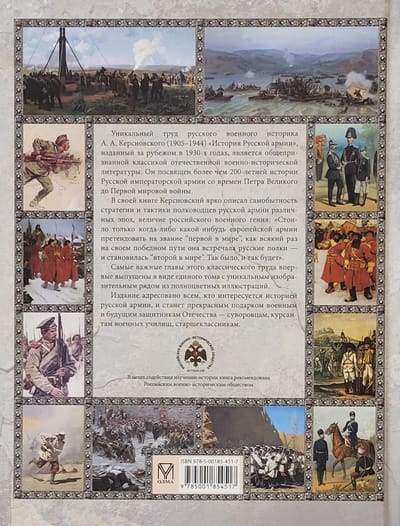 The unique work of the Russian military historian A. A. Kersnovsky (1905-1944) "History of the Russian Army", published abroad in the 1930s, is a generally recognized classic of Russian military-historical literature. It is dedicated to more than 200 years of the history of the Russian Imperial Army from the time of Peter the Great to the First World War. In his book, Kersnovsky vividly described the originality of the strategy and tactics of the commanders of the Russian army of different eras, the greatness of the Russian military genius: "As soon as any European army ever claimed the title of "first in the world", every time on its victorious path it met Russian regiments - and became "second in the world". So it was, and so it will be." The most important chapters of this classic work are published for the first time in the form of a single volume with a unique pictorial series of full-color illustrations. The publication is addressed to everyone who is interested in the history of the Russian army, and will be a wonderful gift for military personnel and future defenders of the Fatherland - Suvorov cadets, cadets of military schools, high school students.