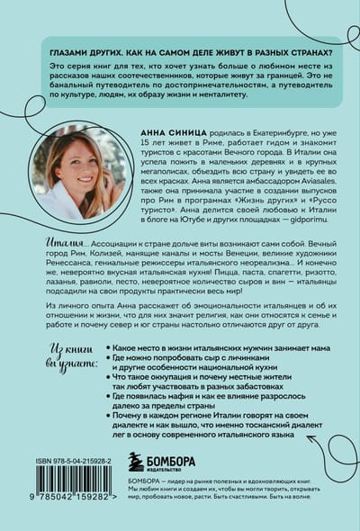 The book "Italy from the Inside" is dedicated to everyone who is in love with the country of la dolce vita, who wants to learn more about the life and customs of Italians, and also to be imbued with the unique atmosphere of the cradle of civilization and world culture. Anna Sinitsa, a guide from Rome, will become your personal guide and help you understand all the intricacies of Italian culture.