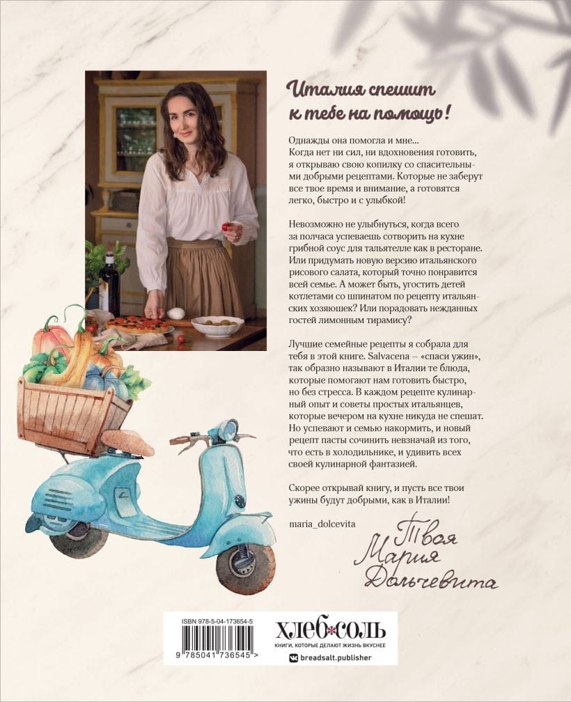It's impossible not to smile when in just half an hour you can create a mushroom sauce for tagliatelle in the kitchen like in a restaurant. Or come up with a new version of Italian rice salad that the whole family will love. Or maybe treat the kids to spinach cutlets according to the recipe of Italian housewives? Or delight unexpected guests with lemon tiramisu? I've collected the best family recipes for you in this book. Salvacena - "save the dinner", so figuratively called in Italy those dishes that help us to cook quickly, but without stress. Each recipe is based on the culinary experience and advice of ordinary Italians who are not in a hurry in the kitchen in the evening. But they have time to feed their families and make a new pasta recipe out of what they have in the fridge, and surprise everyone with their culinary fantasy.