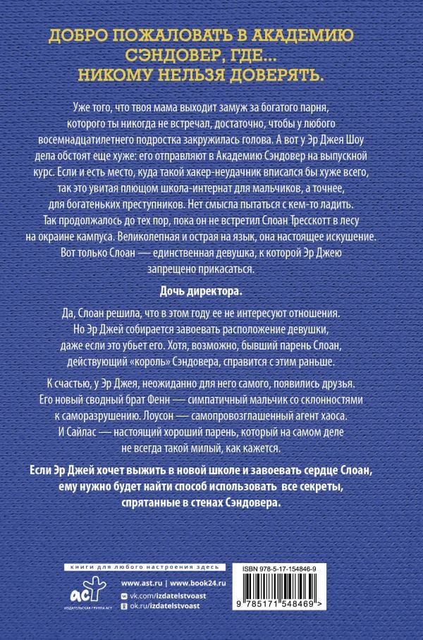 The fact that your mom is marrying a rich guy you've never met is enough to make any eighteen-year-old dizzy. And things are even worse for RJ Shaw: he's being sent to Sandover Academy for his senior year. If there's one place where such a loser hacker would fit in the worst, it's an ivy-covered boarding school for boys, or rather, for rich criminals. No point in trying to get along with anyone. That was until he met Sloane Tresscott in the woods on the edge of campus. Gorgeous and sharp-tongued, she's a real temptation. Except Sloan's the only girl R.J. isn't allowed to touch.