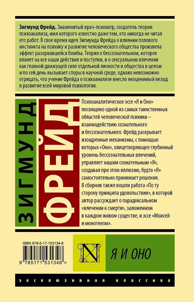 The psychoanalytic essay "The Ego and the Id" explores one of the most mysterious areas of the human psyche—the interaction between the conscious and the unconscious. Freud reveals the intricate mechanisms by which the "Id," representing the deepest level of unconscious drives, controls our conscious "I," creating the illusion that the "I" makes decisions independently. The collection also includes "Beyond the Pleasure Principle," in which the author discusses the paradoxical "death drive" inherent in every living being, and the essay "Moses and Monotheism."
