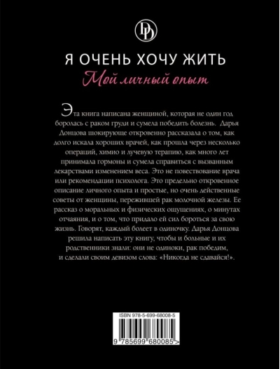 This book is written by a woman who battled breast cancer for years and ultimately overcame the disease. Darya Dontsova, with shocking candor, recounts her long search for good doctors, her endurance of multiple surgeries, chemotherapy, and radiation therapy, her years of hormone therapy, and her successful management of medication-induced weight gain. This isn't a doctor's narrative or a psychologist's advice. It's a brutally honest account of her personal experience and simple, yet powerful, advice from a breast cancer survivor. She recounts her emotional and physical experiences, her moments of despair, and what gave her the strength to fight for her life. They say everyone suffers alone. Darya Dontsova decided to write this book so that both patients and their families know they are not alone, that cancer is surmountable, and she made the words "Never give up!" her motto.