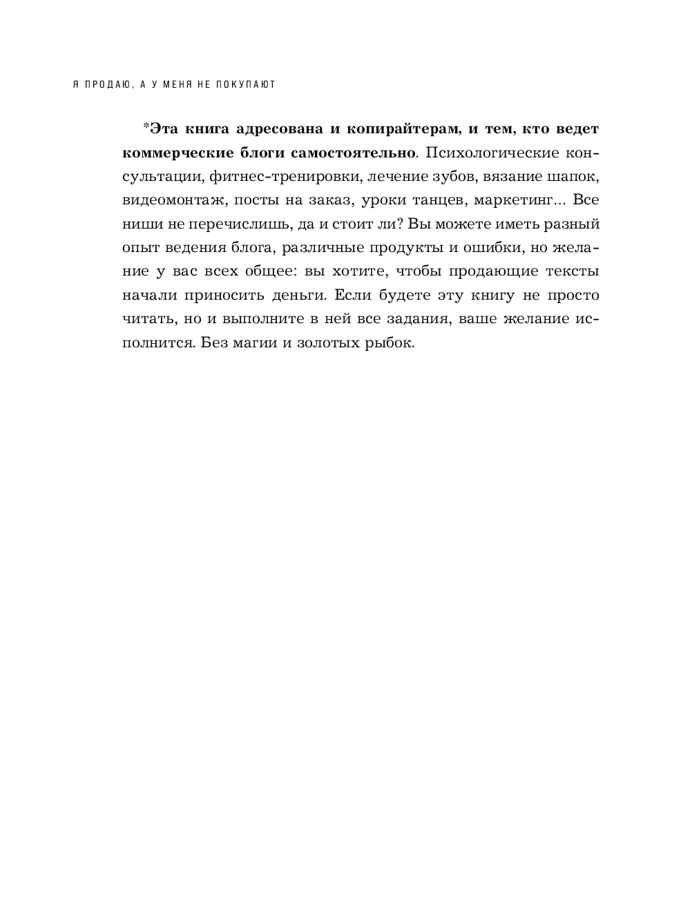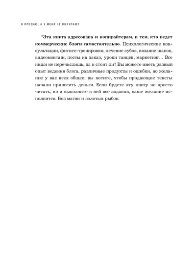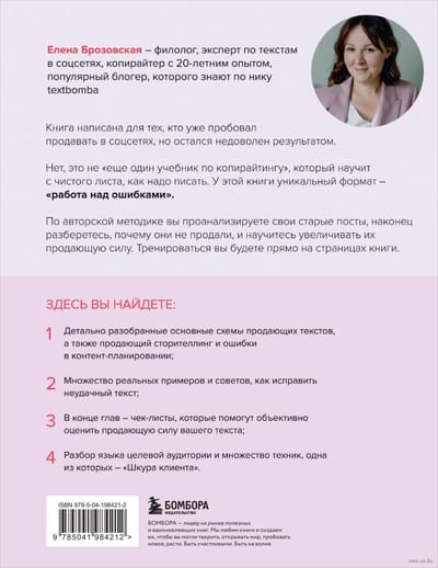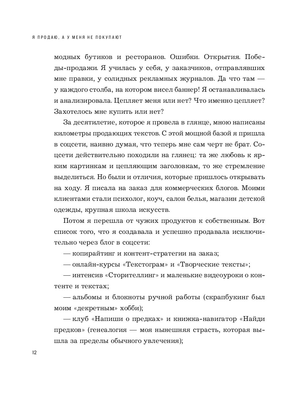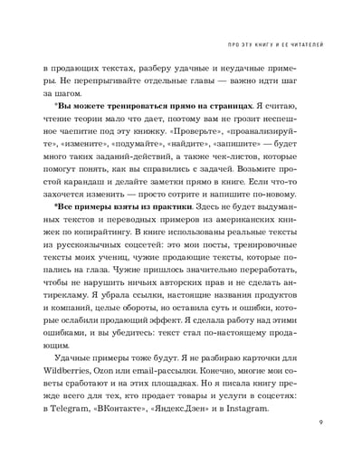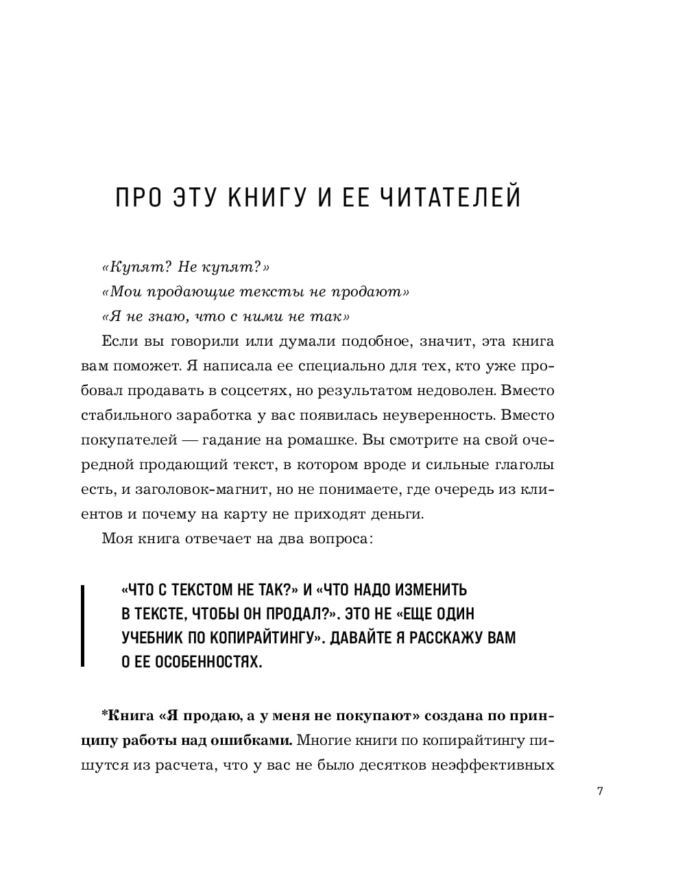 The book is written for those who have already tried selling on social networks, but were not satisfied with the result. No, this is not "another copywriting textbook" that will teach you from scratch how to write. This book has a unique format - "work on mistakes". According to the author's methodology you will analyze your old posts, finally understand why they did not sell, and learn how to increase their selling power. You will practice right on the pages of the book.
