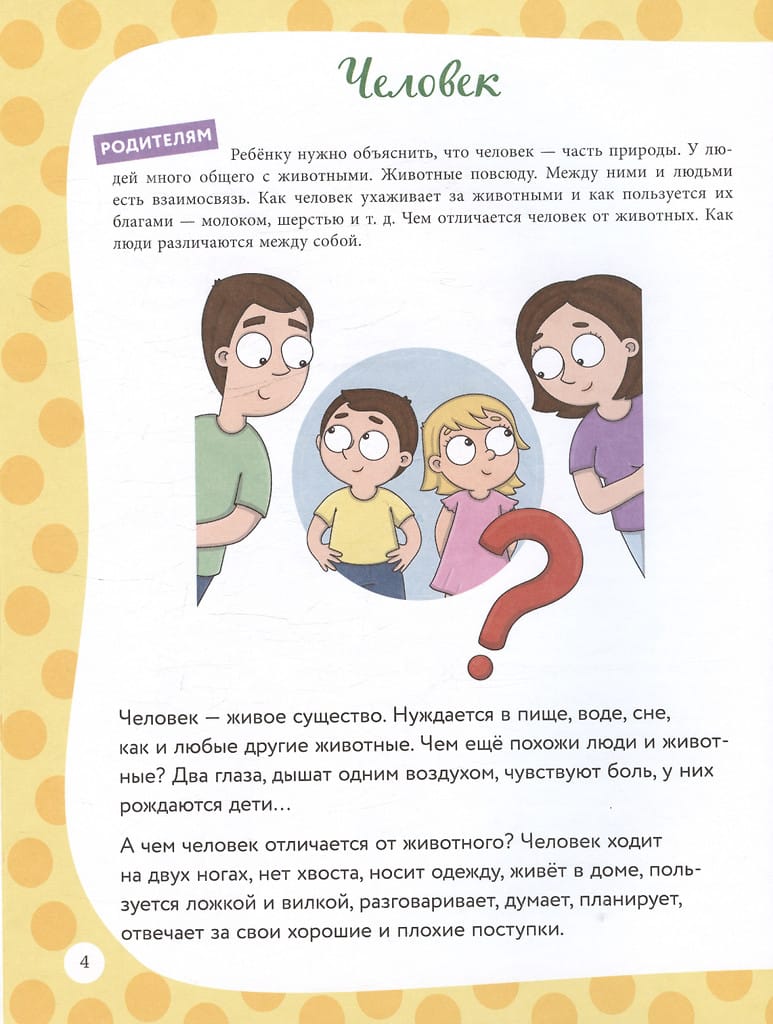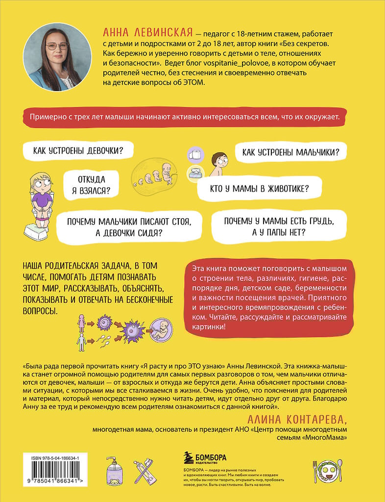 This book will help to talk with your child about body structure, differences, hygiene, how children appear, rules, kindergarten and the importance of visiting doctors. A pleasant and interesting pastime with the child. Read, think and look at the pictures!