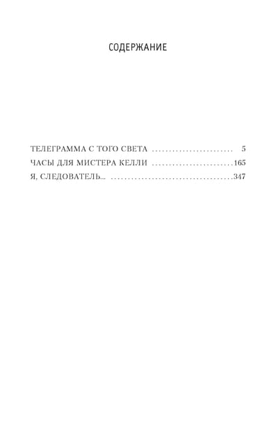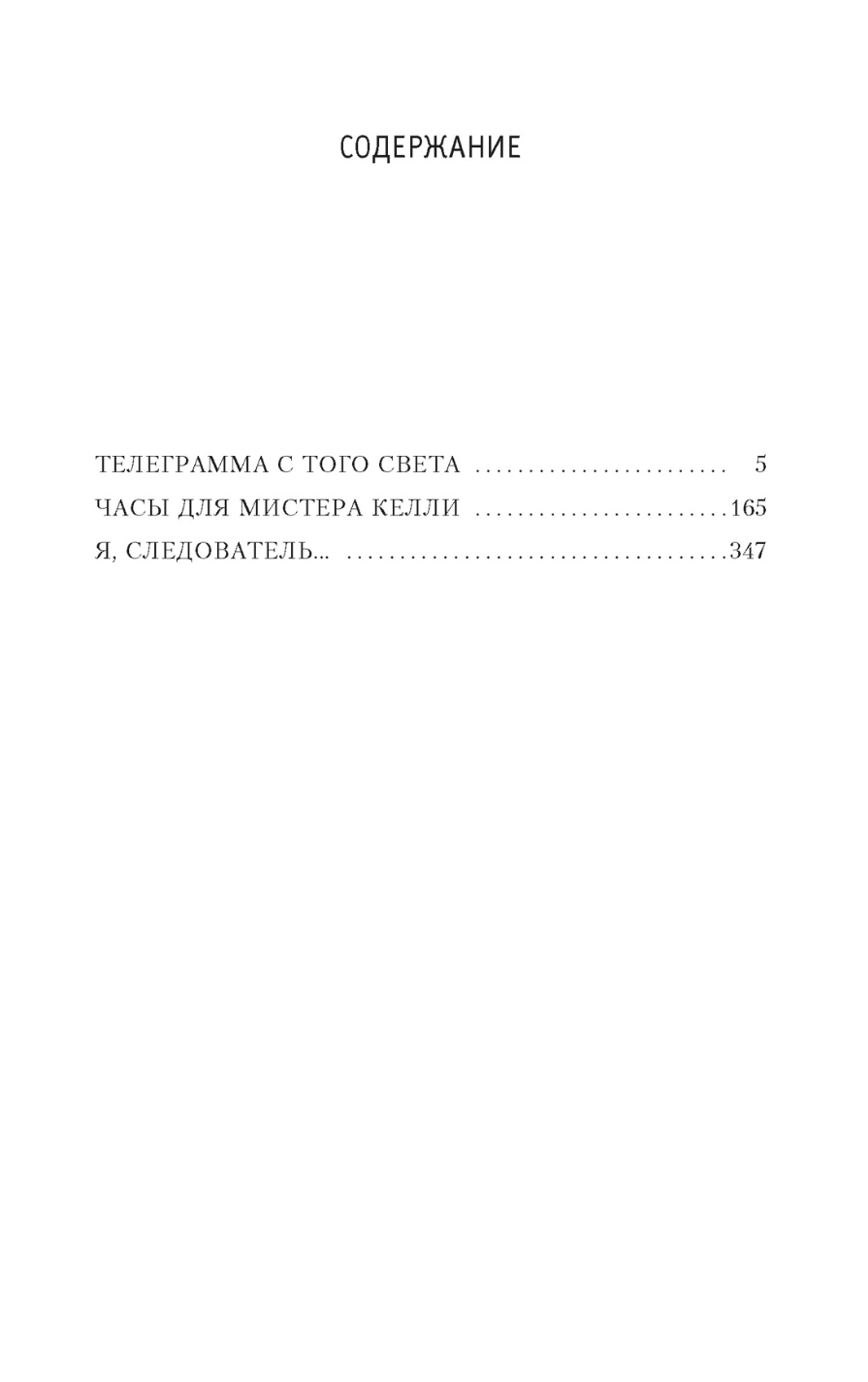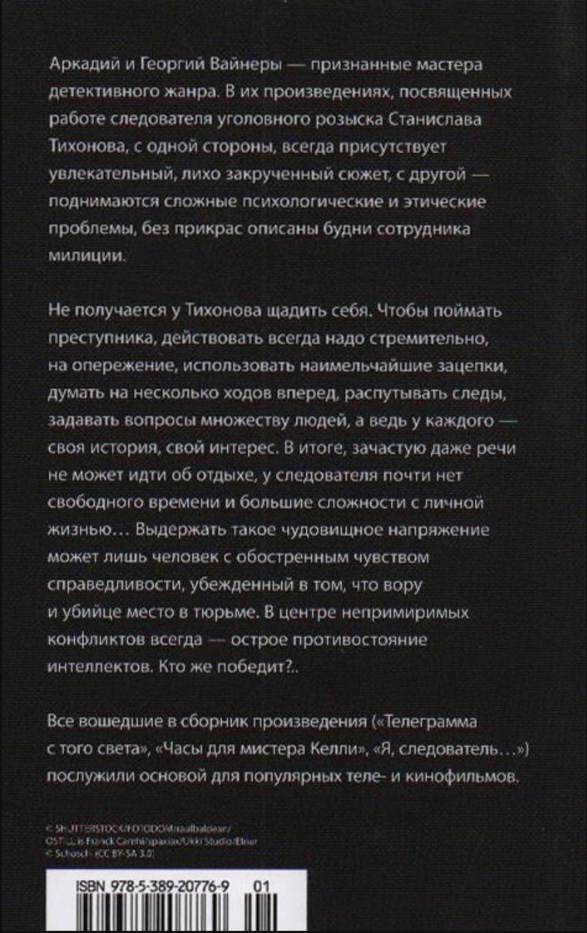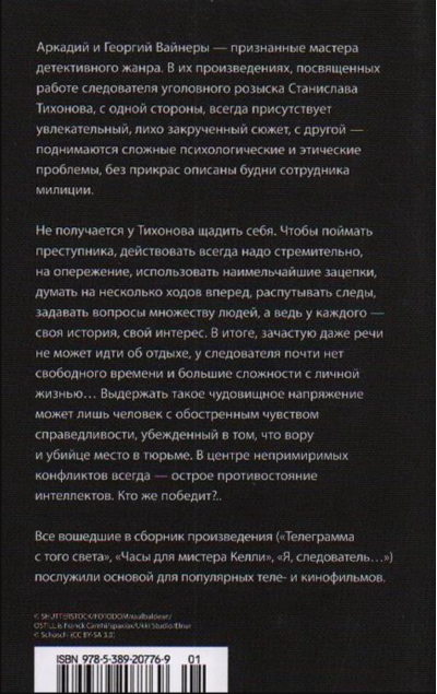 Arkady and Georgy Vainer are renowned masters of the detective genre. Their works, dedicated to the work of criminal investigator Stanislav Tikhonov, always feature a captivating, intricate plot, while also raising complex psychological and ethical issues, depicting the daily life of a police officer without embellishment. Tikhonov never spares himself. To catch a criminal, one must always act swiftly, preemptively, exploit the slightest clues, think several moves ahead, untangle traces, and question numerous people, each with their own story and interests. As a result, rest is often out of the question; the investigator has almost no free time and faces serious difficulties in his personal life. Only a person with a heightened sense of justice, convinced that thieves and murderers belong in prison, can withstand such monstrous tension. All the works included in the collection (“Telegram from the Other World,” “A Watch for Mr. Kelly,” “I, the Investigator…”) served as the basis for popular television and film films.