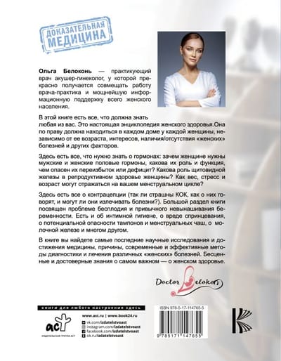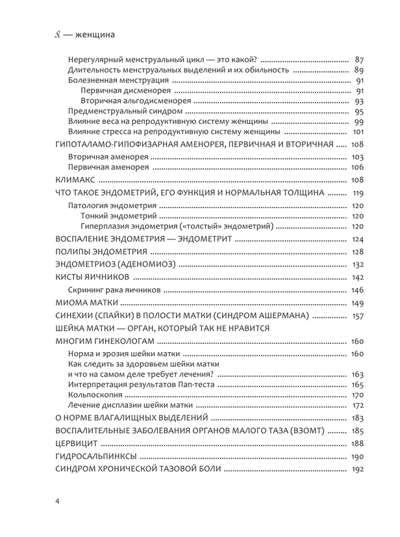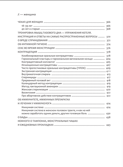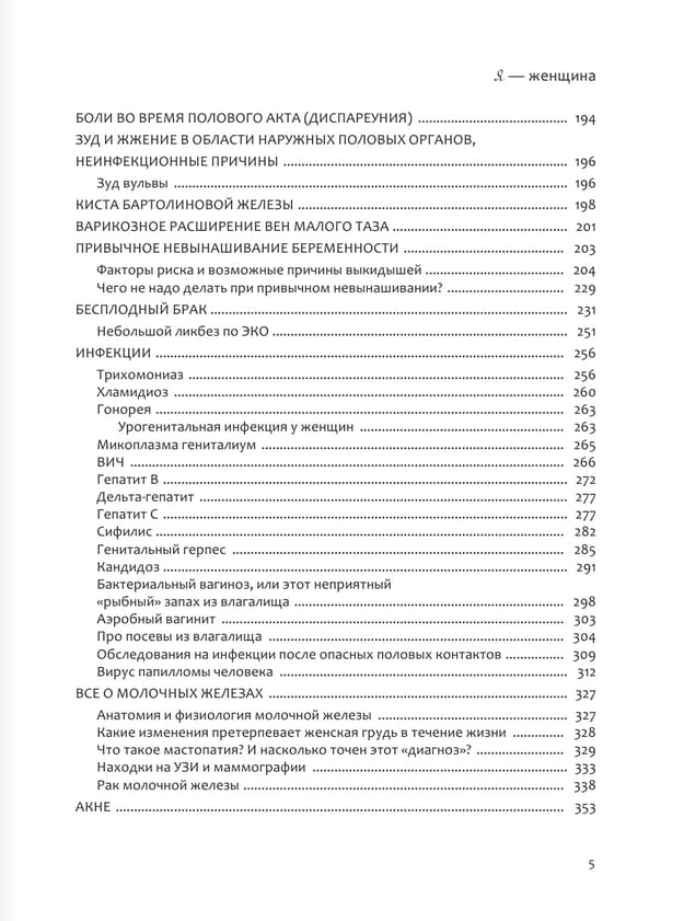 This book has everything any of you should know. It is a real encyclopedia of women's health. It should rightfully be in every woman's home, regardless of her age, interests, presence/absence of "female" diseases and other factors. Here is everything you need to know about hormones: why a woman needs male and female sex hormones, what is their role and function, how dangerous is their overabundance or deficiency? What is the role of the thyroid gland in a woman's reproductive health? How can weight, stress and age affect your menstrual cycle? There's all about contraception (are OCs as scary as they're said to be, and can they cure disease?). A large section of the book is devoted to the problem of infertility and habitual non-pregnancy. There is also about intimate hygiene, the dangers of sprinkling, the potential dangers of tampons and menstrual bowls, breast health and much more. In the book you will find the latest scientific research and medical advances, causes, modern and effective methods of diagnosis and treatment of various "female" diseases. Invaluable and reliable knowledge about the most important thing - women's health.