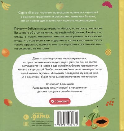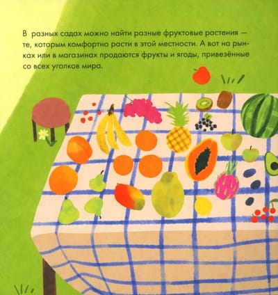 Why does your grandmother's cottage grow apples but not pineapples? You will learn about it from the book dedicated to fruits. And also about where in our stores are different exotic fruits, what useful they contain, what animals eat only fruit and even how to grow your own mango tree from the seed.
