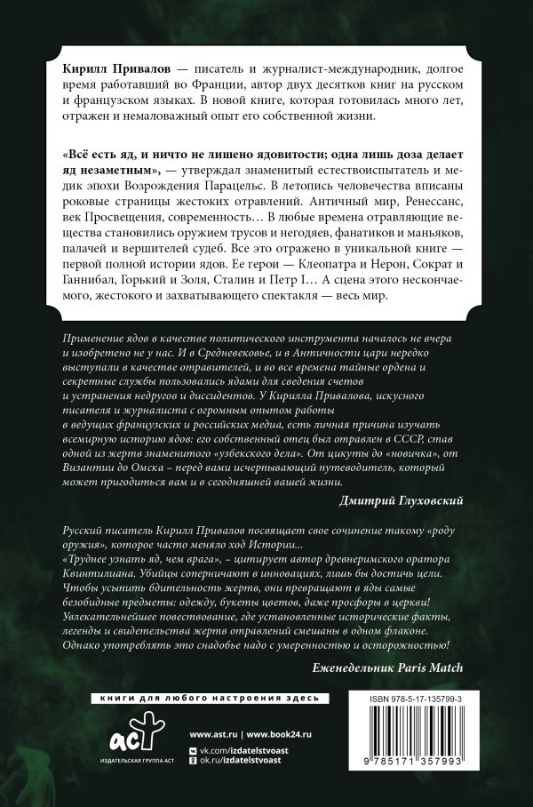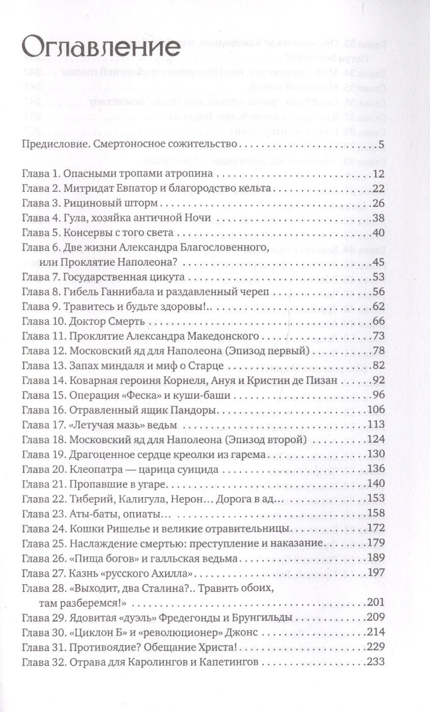 "Everything is poison, and nothing is without poison; only one dose makes the poison imperceptible," said the famous Renaissance scientist and physician Paracelsus. The annals of mankind are filled with fatal pages of cruel poisonings. The ancient world, the Renaissance, the Age of Enlightenment, modern times... At all times, poisonous substances have become weapons of cowards and scoundrels, fanatics and maniacs, executioners and arbiters of fate. All this is reflected in a unique book - the first complete history of poisons. Its heroes are Cleopatra and Nero, Socrates and Hannibal, Gorky and Zola, Stalin and Peter I... And the stage of this endless, cruel and exciting performance is the whole world.