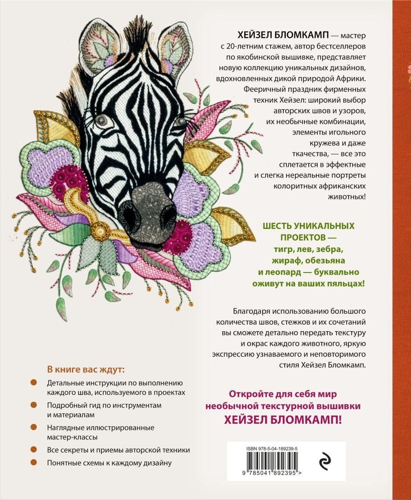 Hazel Blomkamp, a master embroiderer with 20 years' experience, presents a new collection of unique designs inspired by the wildlife of Africa. A fabulous feast of Hazel's signature techniques: a wide range of author's stitches and patterns, their unusual combinations, elements of needle lace and even weaving - all this is woven into spectacular and slightly unreal portraits of colorful African animals! Six unique projects - tiger, lion, zebra, giraffe, monkey and leopard - will literally come to life on your hoop!