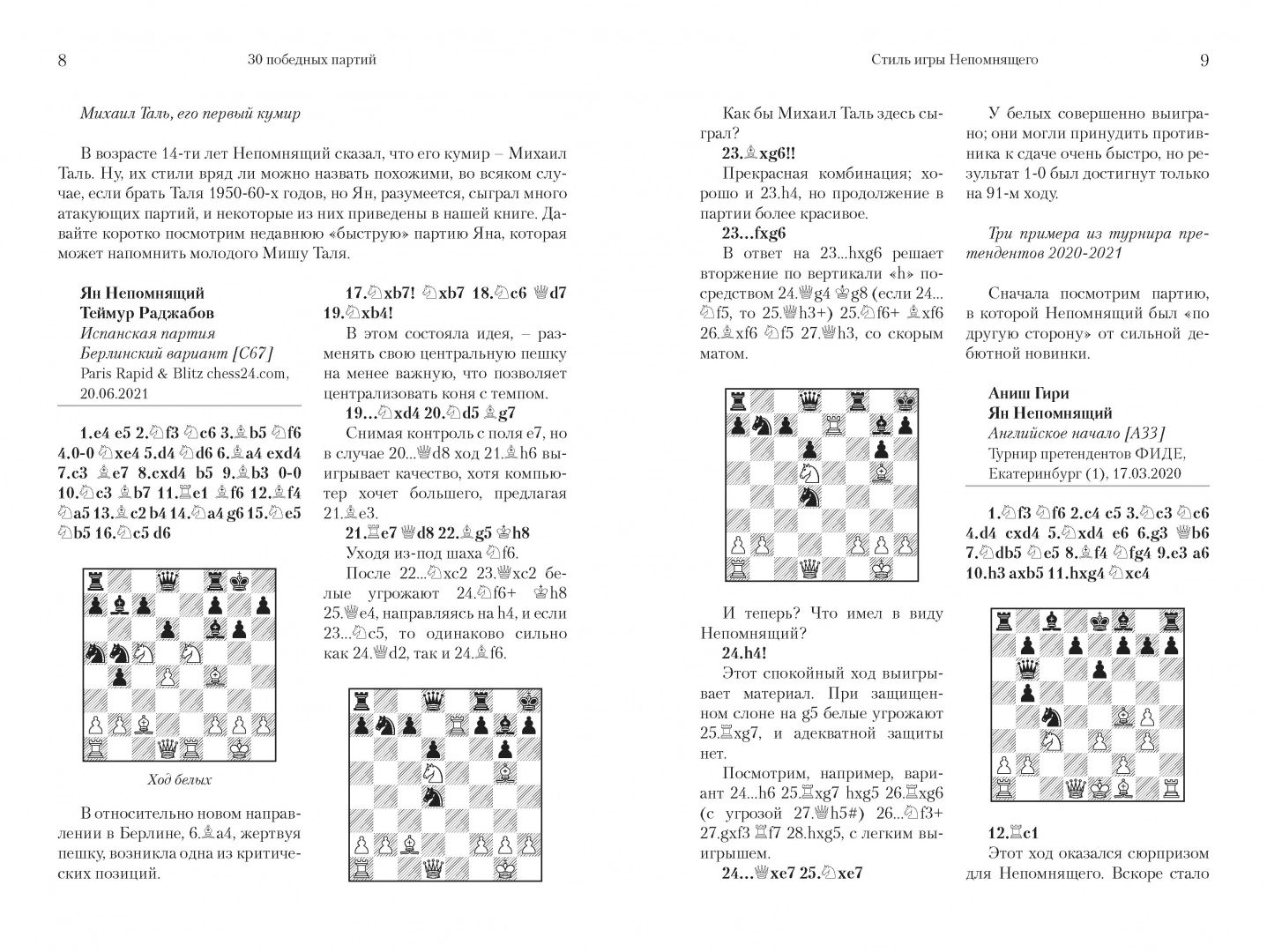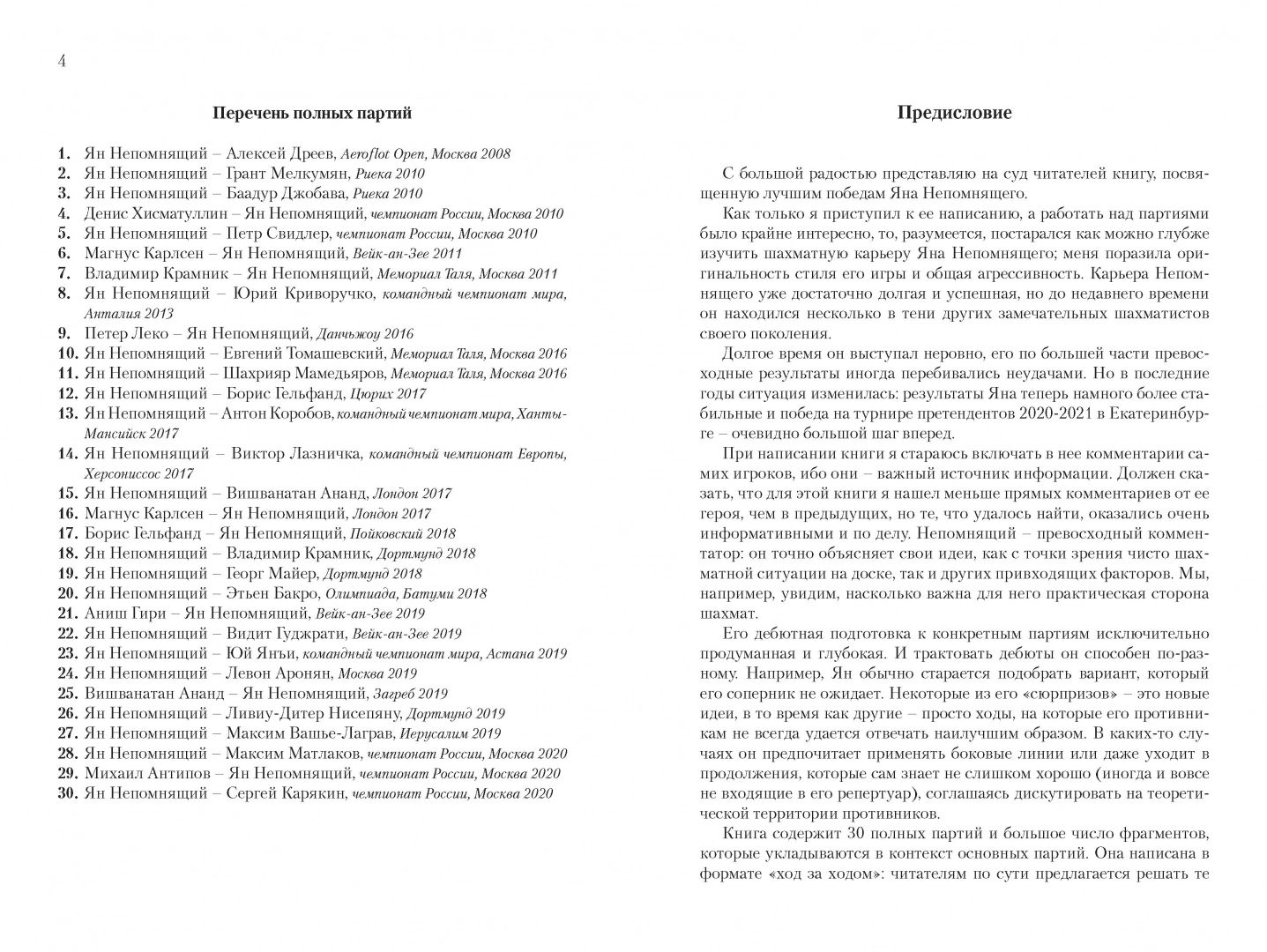 Most of the games are taken from Nepomnyashchy's recent work. Almost all of his opponents are super-grossmasters - world champion Magnus Carlsen, former world champions Vishy Anand and Vladimir Kramnik, as well as Maxim Vachier-Lagrave, Sergey Karjakin, Levon Aronian, Peter Svidler, Boris Gelfand, Anish Giri and others.