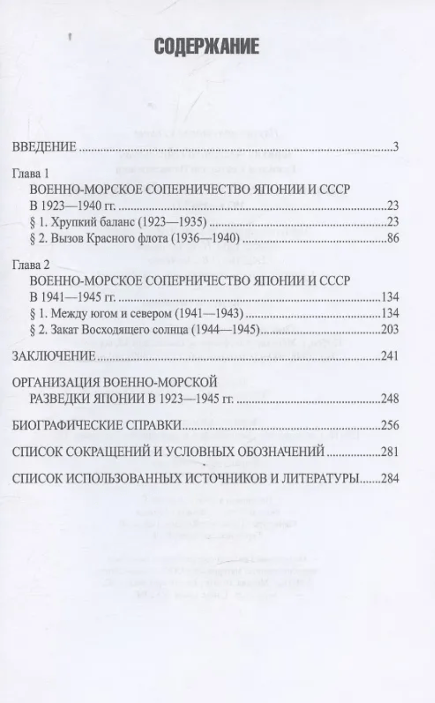 The book is devoted to the history of the period of naval confrontation between the USSR and Japan after the end of the intervention in 1922 and until the defeat of Tokyo in World War II in 1945, the events of the Pacific campaign at sea in 1941-1945 and the Soviet-Japanese War of 1945. The authors examine the role of intelligence and counterintelligence of both countries in providing their governments with information about the naval power and intentions of a potential enemy, its influence on operational planning and changes in the military doctrine of the two states.