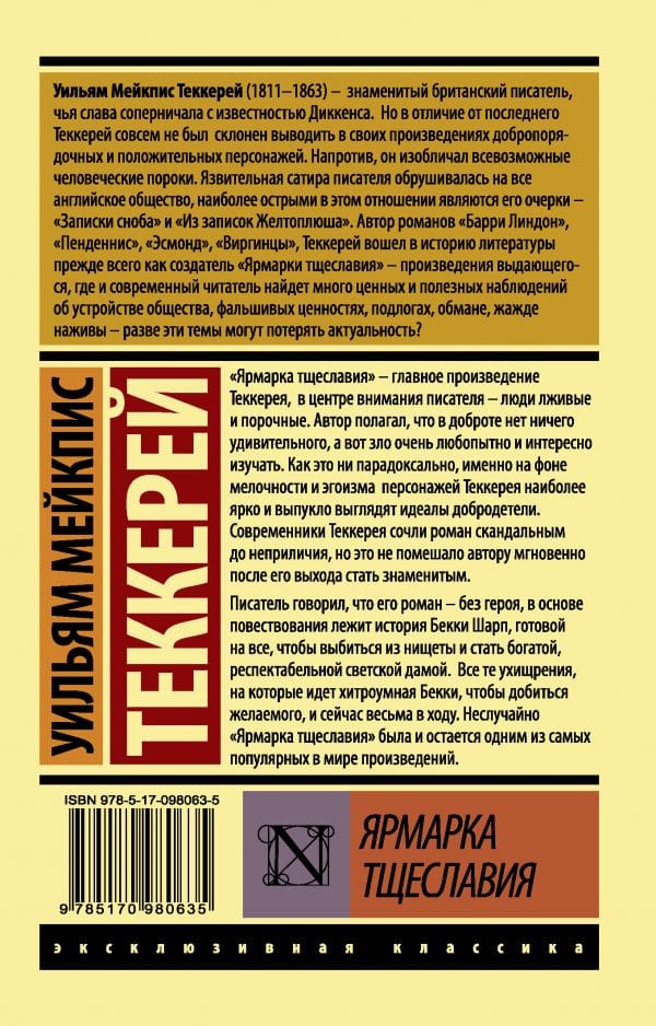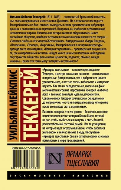 "Vanity Fair" - the main work of Thackeray, in the center of the writer's attention - people deceitful and vicious. The author believed that in goodness there is nothing surprising, but evil is very curious and interesting to study. Paradoxically, it is against the background of pettiness and selfishness of Thackeray's characters most brightly and convexly look the ideals of virtue. Thackeray's contemporaries considered the novel scandalous to the point of obscenity, but this did not prevent the author immediately after its release to become famous. The writer said that his novel - without a hero, the narrative is based on the story of Becky Sharp, ready for anything to get out of poverty and become a rich, respectable society lady. All those tricks that goes cunning Becky, to achieve the desired, and now very much in use. It is no coincidence that "Vanity Fair" was and remains one of the most popular works in the world.