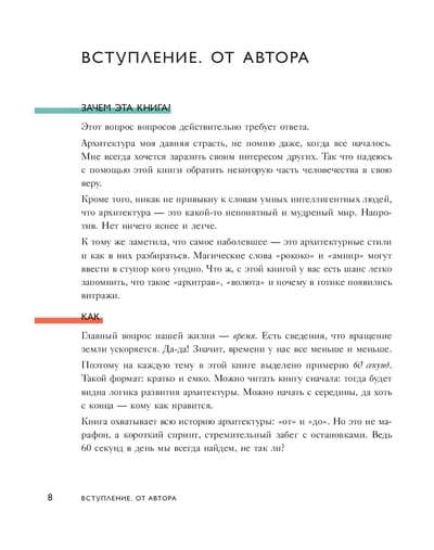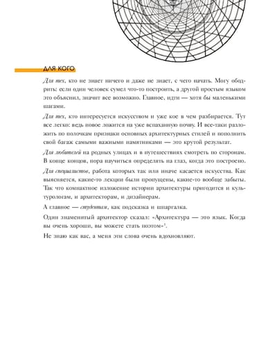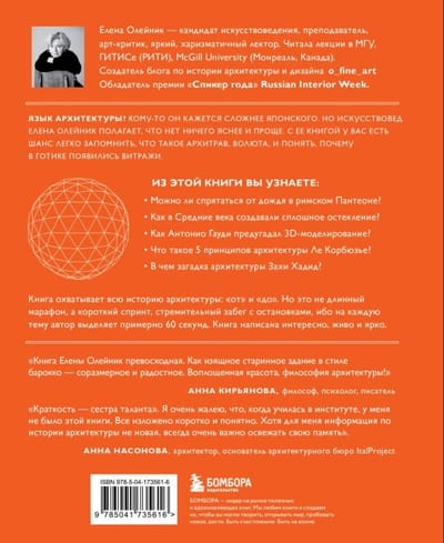 Understanding architecture has now become even easier: the author of the book Elena Oleynik, a PhD in art history, teacher, art critic, bright charismatic lecturer and winner of the Speaker of the Year award of Russian Interior Week 2024, thanks to the detailed structured information will help you understand not only styles, trends and terms, but also how, thanks to the diversity of architectural solutions, you can get to know different periods of our history better. The richly illustrated publication will allow you to delve deeper into the topic, teach you how to distinguish between Baroque and Rococo, answer questions about what such famous architects as Zaha Hadid and Le Corbusier are famous for, and whether you can hide from the rain in the Pantheon. It is here that you will learn how the severity of romanticism is replaced by the sophistication of Gothic and how knowledge of architecture will help us see the cyclical nature of history.
