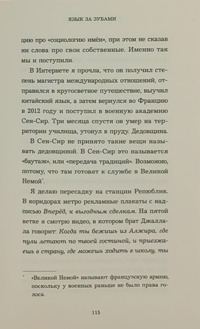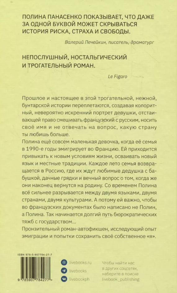 Past and present are intertwined in this touching, tender, rebellious story, creating a colorful, incredibly sincere portrait of a girl defending the right to mix French with Russian, to carry her own name, and not to answer the question of which country you love more. Polina is just a young girl when her family emigrates to France in the 1990s. She has to get used to new living conditions, learn a new language and local traditions. Every summer the family returns to Russia, where their favorite grandparents, dacha beds and the eternal question of when they will finally return to their homeland are waiting for them. As time goes by, Polina is increasingly torn between two languages, two countries, two cultures. That's why it is important to her that in French documents it should be written not Pauline, but Pauline. So begins a long journey of bureaucratic litigation with the state... A poignant novel-autofiction that explores the experience of emigration and attempts to preserve one's own self.