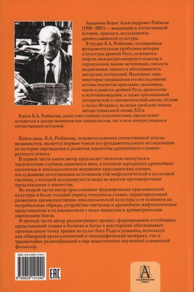 This book was written by Academician B.A. Rybakov, a distinguished historian and archaeologist, expert on the culture of ancient and medieval Rus', and the founder of the Russian school of medieval studies. It is the first volume of his fundamental study on the history of the origin and development of paganism among the ancient Slavic-Russian ethnic group.