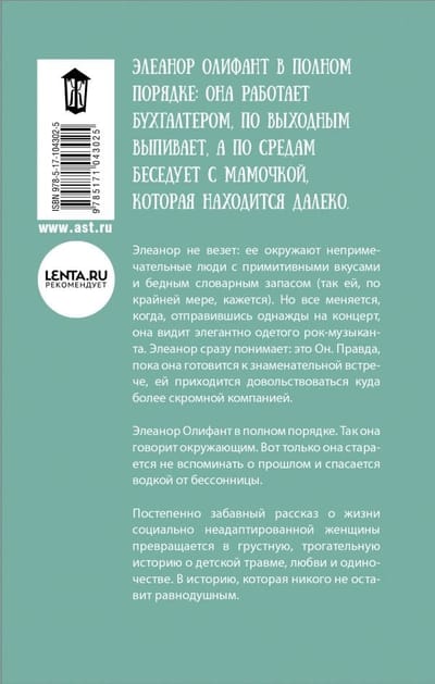 Eleanor Oliphant is perfectly fine: she works as an accountant, drinks on weekends, and on Wednesdays talks to her faraway mommy. Eleanor has no luck: she is surrounded by unremarkable people with primitive tastes and a poor vocabulary (at least it seems that way to her). But everything changes when, going to a concert one day, she sees an elegantly dressed rock musician. Eleanor immediately realizes: it's him. But as she prepares for the momentous meeting, she has to make do with much more modest company.