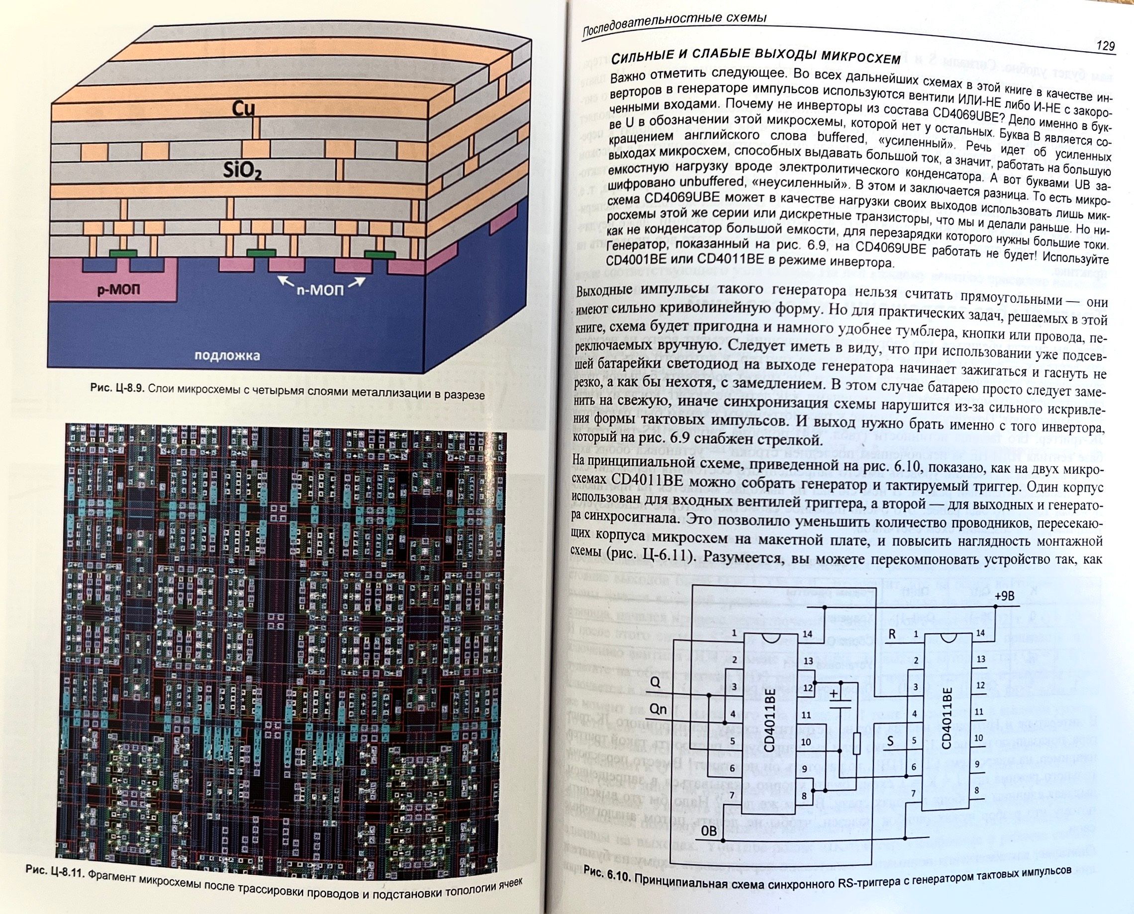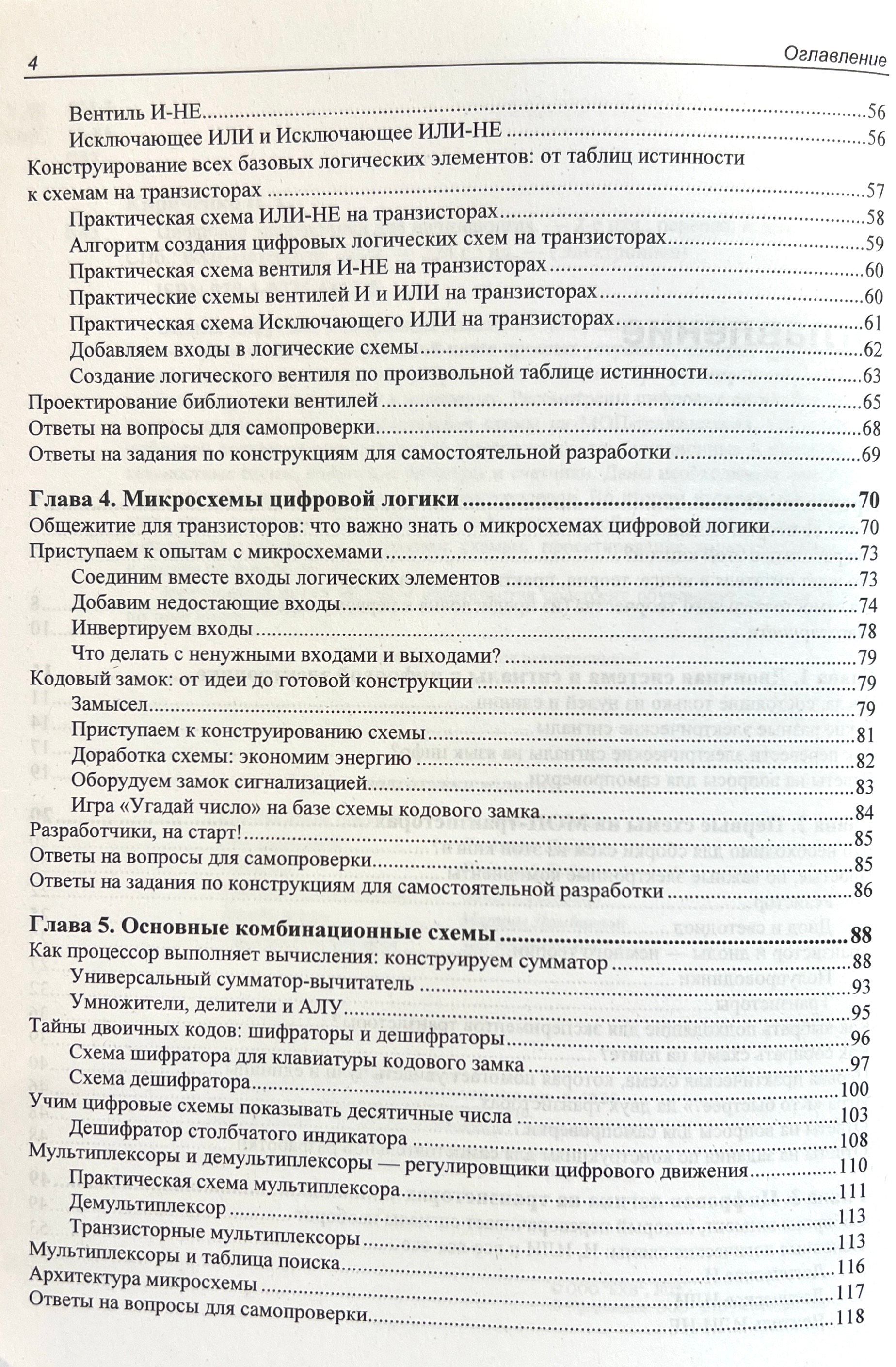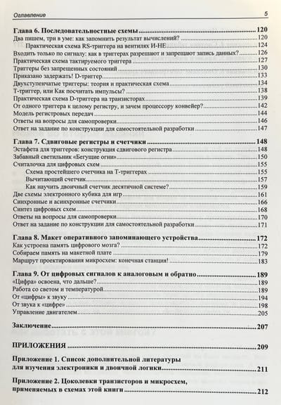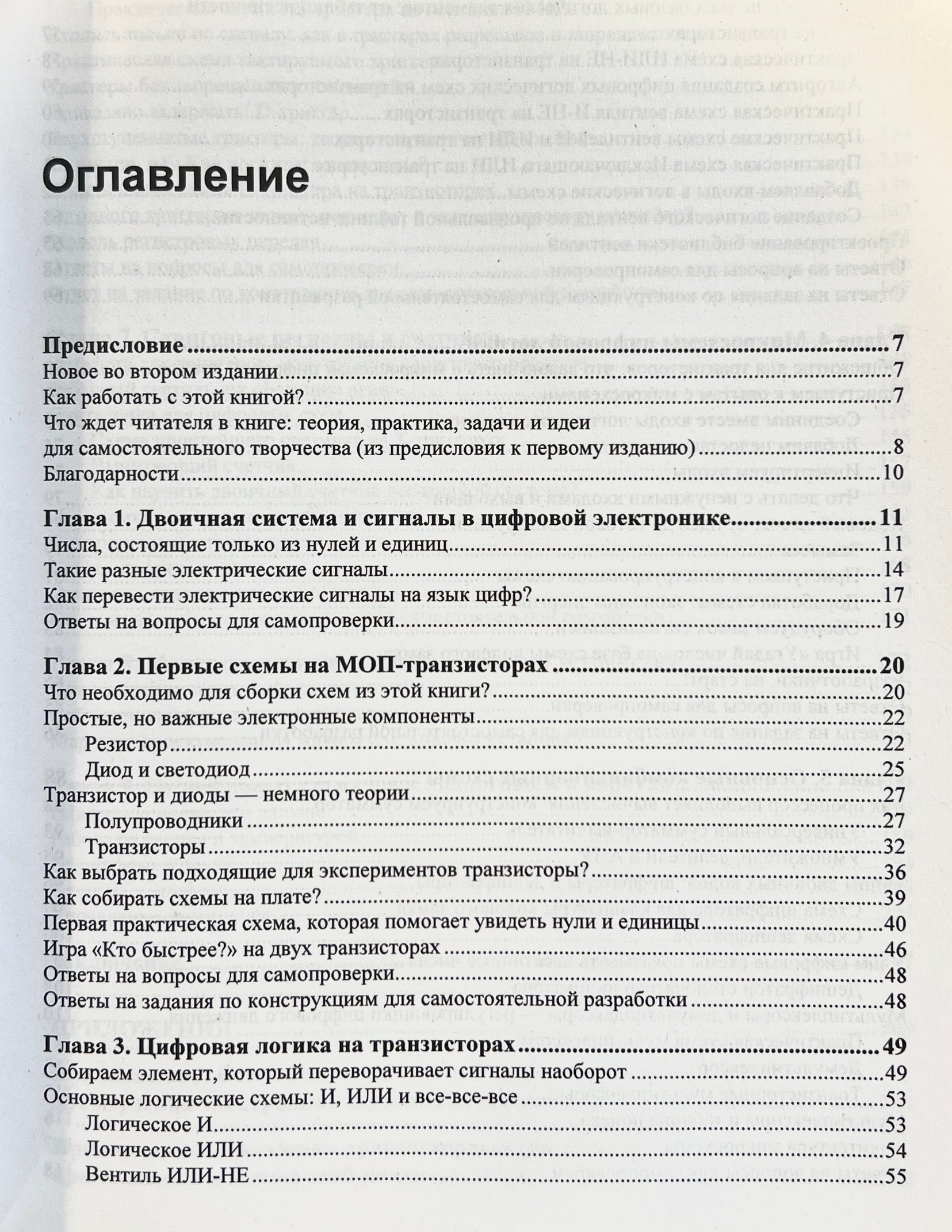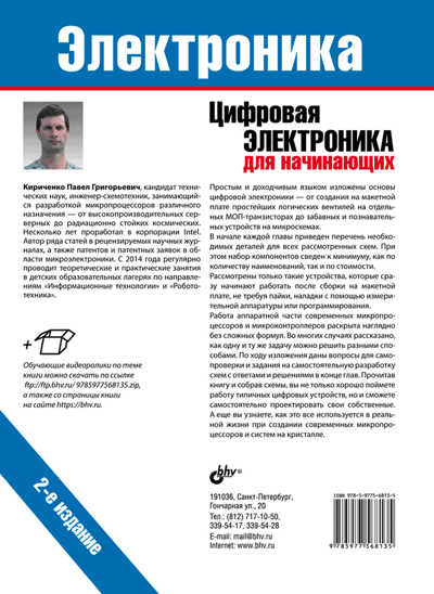 The basics of digital electronics are presented in an accessible way for beginners - by creating simple devices on a breadboard, which immediately after assembly begin to work, without the need for soldering, adjustment and programming. The set of necessary parts is minimized. Digital signals and binary number system, the simplest schemes on MOSFETs, digital logic devices on transistors and microcircuits, combinational and sequential circuits, shift registers and counters are considered. Necessary information on the operation of microprocessors and microcontrollers is given. The second edition adds a chapter on interfacing analog and digital devices, describes the connection of analog devices to digital circuits, the design of microprocessors and systems on a chip.The electronic archive on the publisher's website contains training videos on the subject of the book.