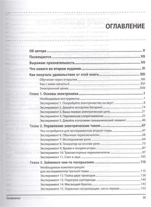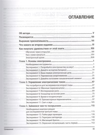 The practical experiments cover the basics of electronics and show how to design, debug and manufacture electronic devices at home. The material is presented sequentially from simple to complex, starting with simple experiments with electric current and ending with the creation of complex devices using transistors and microcontrollers. The basic laws of electronics are described, as well as the principles of functioning of various electronic components. It shows how to make a security alarm system, Christmas tree lights, electronic ornaments, a sound conversion device, a code lock, etc. The book contains step-by-step instructions and instructions on how to make a device. Step-by-step instructions and more than 500 illustrative drawings and photos are given. In the second edition, the text of the book has been significantly revised, more accessible electronic components are used in the experiments, and new projects have been added, including those with the Arduino controller. New in the second edition! - The text is significantly revised, new projects are added and changes are made to the old ones - The composition of components for performing experiments is revised to reduce their number and price - Projects using the Arduino board are included After reading the book, you will be able to: - Discover a wonderful new world, learning from successful and unsuccessful experiments with electronic components. - Create a project-friendly workspace at home, equipped with devices and tools. - Learn more about basic electronic components and the functions they perform in an electrical circuit. - Make a home intruder alarm, Christmas tree lights, electronic clothing ornaments, a sound conversion device, a human reaction speed tester, and a code lock. - Have a clear, understandable explanation of what you are doing and why.