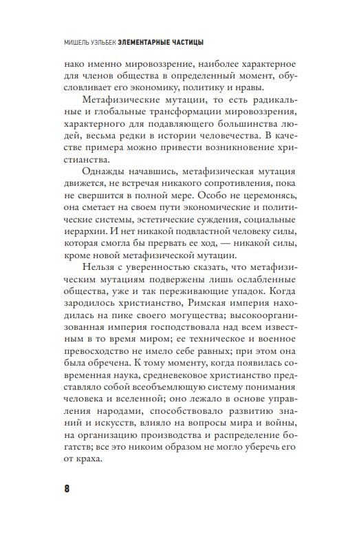Michel Houellebecq's rise to world fame began a quarter of a century ago with the publication of his novel "The Elementary Particles". This was followed by the planetary bestsellers "Platform", "The Possibility of an Island", "Submission", "Serotonin", "Destroy", the Goncourt Prize and the Legion of Honor. At the center of the sensational novel is the fate of two brothers. Both, each in his own way, persistently seek happiness in the world around them, obviously not created for happiness. One of them, a biologist, makes an assumption about the possibility of radical changes in human genes, as a result of which a new species of "happy" people should appear. Houellebecq allowed these thinking beings, not subject to human weaknesses and delusions, to judge the lives of our contemporaries and managed to do what few have managed: he truly shocked the public. The novel was nominated for the Goncourt Prize, but did not win it, but it did win a kind of "anti-Goncourt" - the November Prize - and was recognized by the authoritative magazine Lire as the Best Book of the Year. Published in a new translation by Maria Zonina.