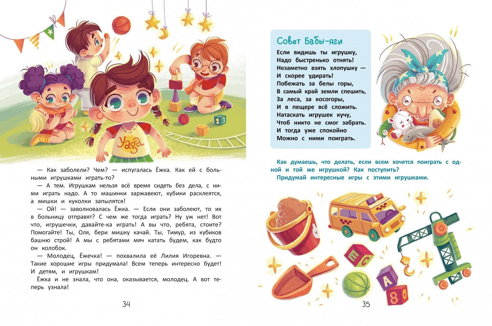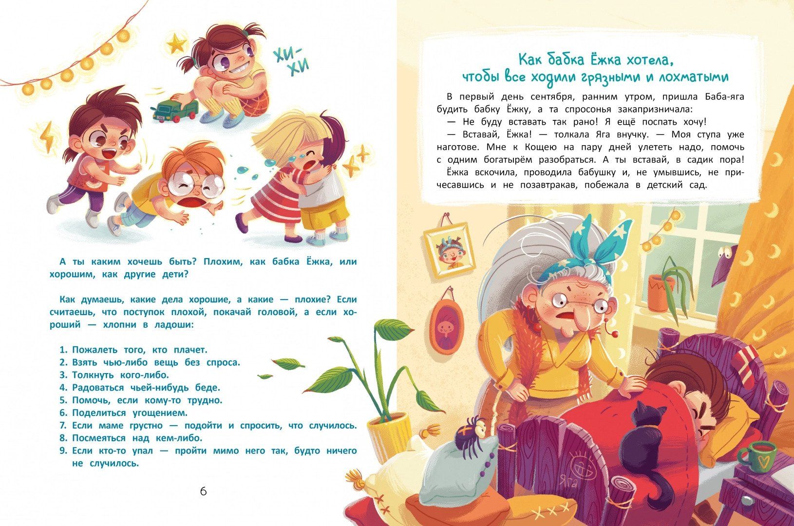 You know what the secret to good behavior is? Not doing bad things. That's what we need to teach our children. Once they understand how not to behave, they will learn to do the right thing. But how do we show them what bad behavior is? On the example of negative characters in Russian fairy tales! The little reader will get acquainted with Baba Yaga's granddaughter - Baba Yaga too, only a little one - Babka Yezhka, who pranks like an adult! Without moralizing, constant reprimands and other unproductive methods of education, we will teach children to be good, explain how to act and how not to act, show them where bad behavior can lead them. They will learn how to behave properly at home, on the street, in kindergarten and at school. They will understand how to communicate, express feelings, overcome difficulties and get out of difficult situations. Raising your baby on funny fairy tales, you will teach him to understand "what is good and what is bad". He will remember how to behave and change his bad behavior. We wish your little ones to grow up to be really good people!