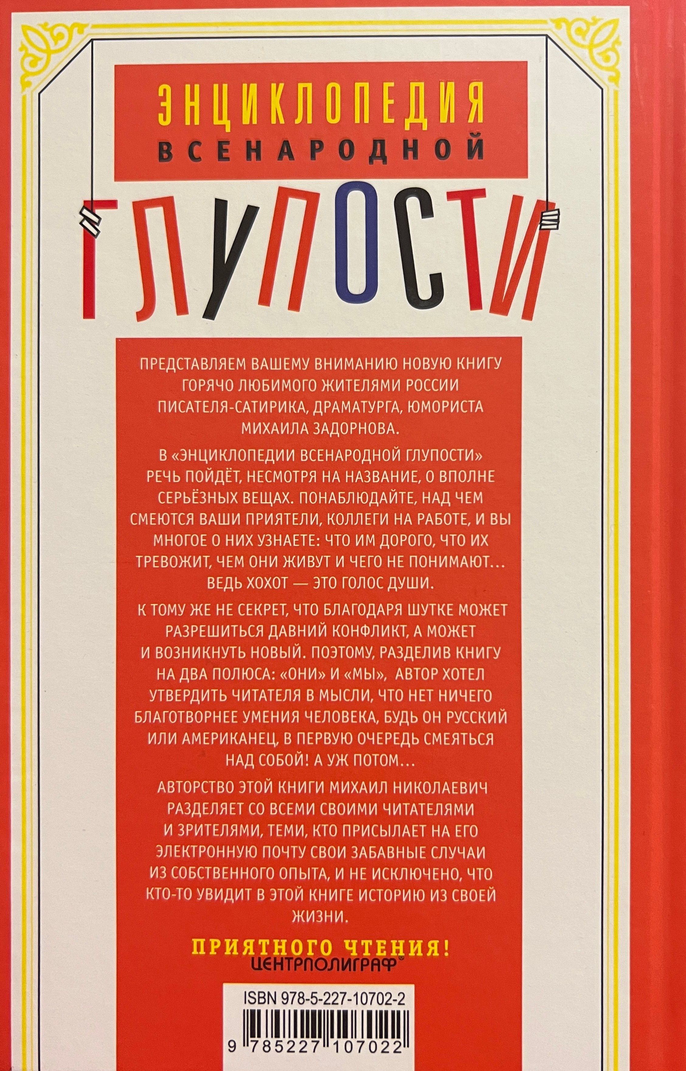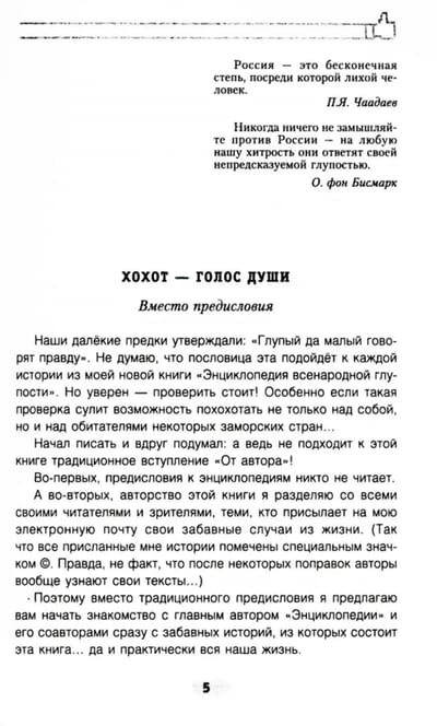 We present to you a new book by Mikhail Zadornov, a beloved Russian writer, satirist, playwright, and humorist. Despite its title, "The Encyclopedia of Popular Stupidity" addresses quite serious matters. Observe what your friends and colleagues at work laugh about, and you'll learn a lot about them: what they hold dear, what worries them, how they live, and what they don't understand... After all, laughter is the voice of the soul. Moreover, it's no secret that a joke can resolve a long-standing conflict, or even spark a new one. Therefore, by dividing the book into two poles: "They" and "We," the author wanted to reinforce the idea that there is nothing more beneficial than a person's ability, be they Russian or American, to laugh at themselves first and foremost! And then... Mikhail Nikolaevich shares the authorship of this book with all his readers and viewers, those who send him their funny stories from their own experiences by email, and it's possible that someone will see a story from their own life in this book. Enjoy reading!