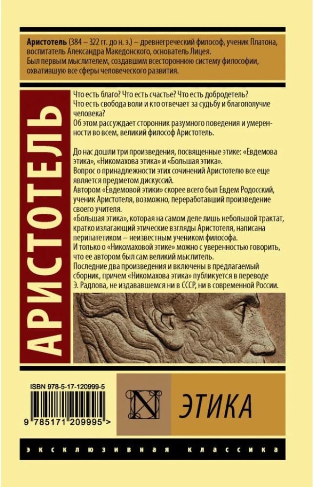 What is goodness? What is happiness? What is virtue? What is free will and who is responsible for the fate and well-being of man? The great philosopher Aristotle, a supporter of reasonable behavior and moderation in everything, argues about this. Three works devoted to ethics have come down to us: "Eudemov Ethics", "Nicomachean Ethics" and "Great Ethics". The question of whether these works belong to Aristotle is still a matter of debate. The author of "Eudemus Ethics" was most likely Eudemus of Rhodes, a student of Aristotle, who may have reworked his teacher's work. "The Great Ethics," which is really only a small treatise summarizing Aristotle's ethical views, was written by a Peripatetic, an unknown student of the philosopher. And only about "Nicomachean Ethics" we can say with certainty that its author was the great thinker himself. The latter two works are included in the proposed collection, and the Nicomachean Ethics is published in a translation by E. Radloff, which has not been published either in the USSR or in modern Russia.