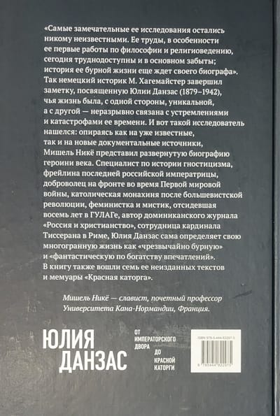 "Her most remarkable studies have remained unknown to anyone. Her writings, especially her first works on philosophy and religious studies, are today difficult to access and largely forgotten; the story of her turbulent life still awaits its biographer." Thus German historian M. Hagemeister concluded the note devoted to Julia Danzas (1879-1942), whose life was, on the one hand, unique, and on the other - inextricably linked to the aspirations and catastrophes of her time. And now such a researcher found: relying on both already known and new documentary sources, Michel Nicaud presented a detailed biography of the heroine of the century. A specialist in the history of Gnosticism, a maid of honor to the last Russian empress, a volunteer at the front during World War I, a Catholic nun after the Bolshevik Revolution, a feminist and mystic who served eight years in the Gulag, the author of the Dominican journal "Russia and Christianity", and an employee of Cardinal Tisserand in Rome, Julia Danzas herself defines her multifaceted life as "extremely turbulent" and "fantastic in the richness of her impressions". The book also includes seven of her unpublished texts and her memoir, Red Penalization. Michel Nicaud is a Slavist and Professor Emeritus at the University of Caen-Normandy, France. Supplemented with new archival documents and revised by the author, the French version is Michel Niqueux. Julia Danzas (1879-1942). De la cour impériale au bagne rouge. Genève: Éditions des Syrtes, 2020.