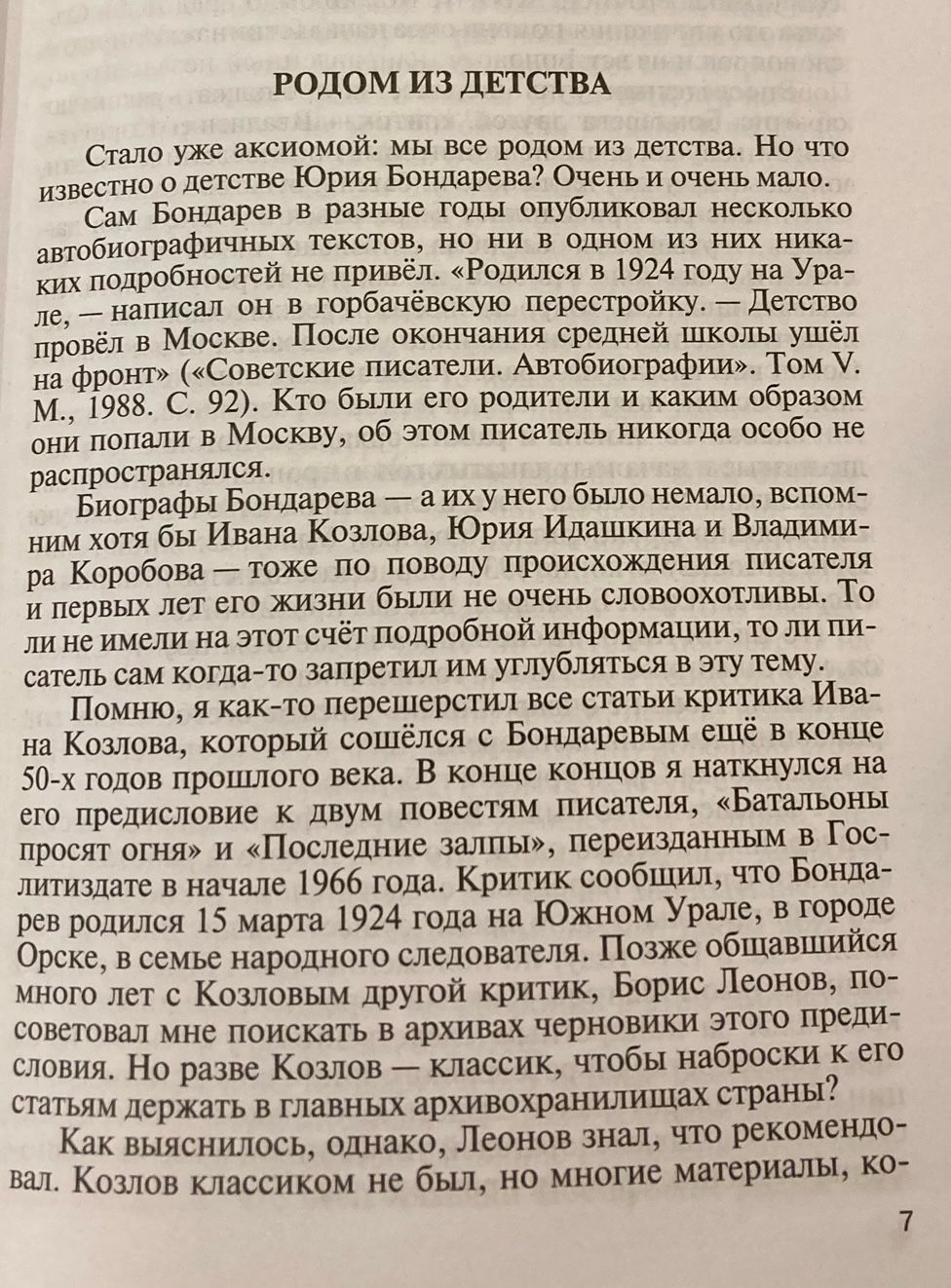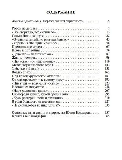 Yuri Vasilyevich Bondarev (1924 - 2020) is recognized as one of the classics of Soviet literature, the founder of "lieutenant prose". His story "Battalions Ask for Fire", novels "Hot Snow", "Silence", "Shore", "Choice" became a new word in depicting the military theme, they were republished and filmed many times. For many years, Bondarev was a member of the leadership of the Union of Writers of Russia, and later headed it. But very little is known about his life - the writer preferred not to make his personal affairs and memories public. The author of the first biography of Bondarev, the famous critic and publicist Vyacheslav Ogryzko, painstakingly collected facts in archival funds, books and articles that paint not only a living portrait of his hero, but also the literary life of the Soviet era.